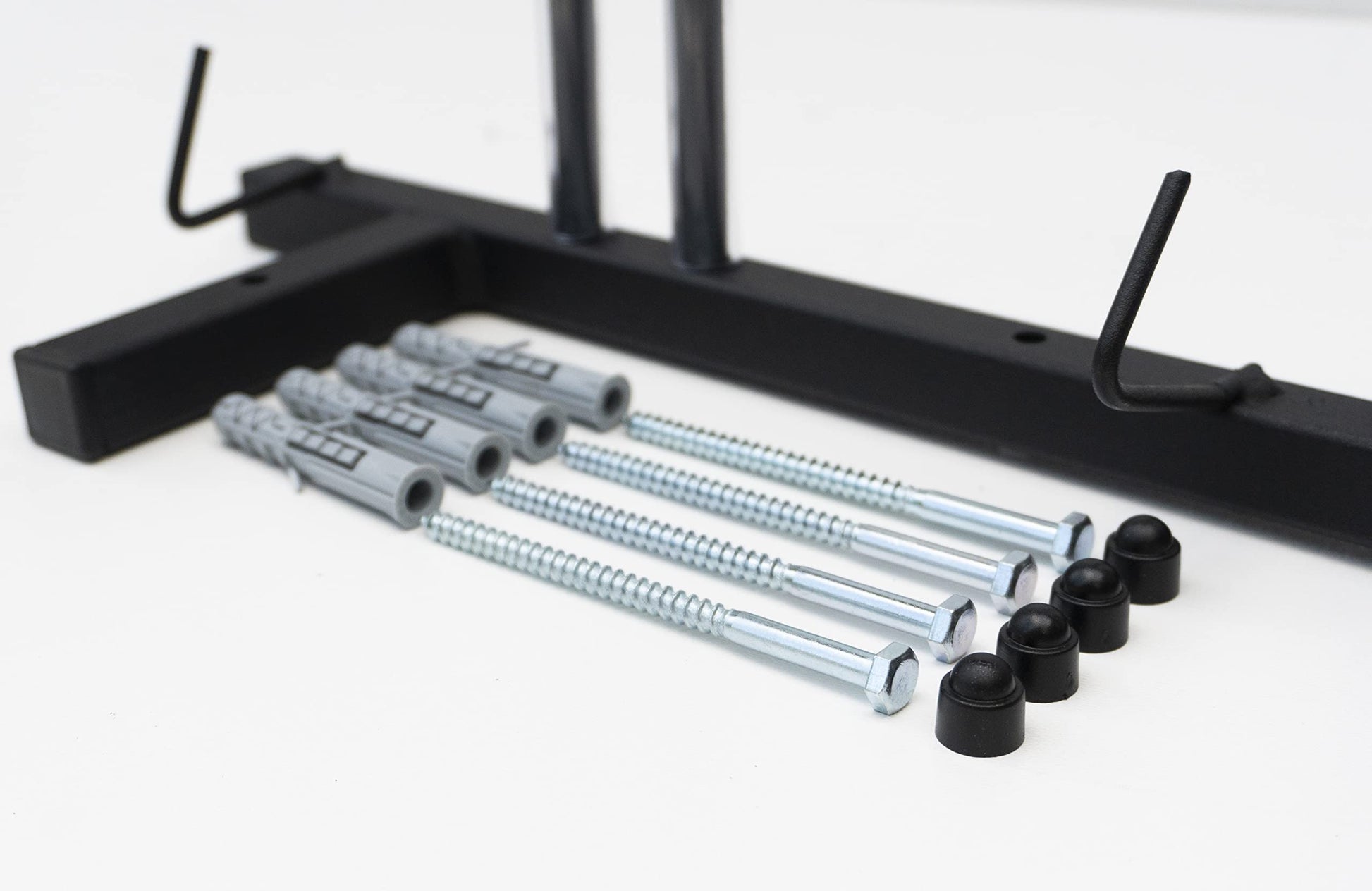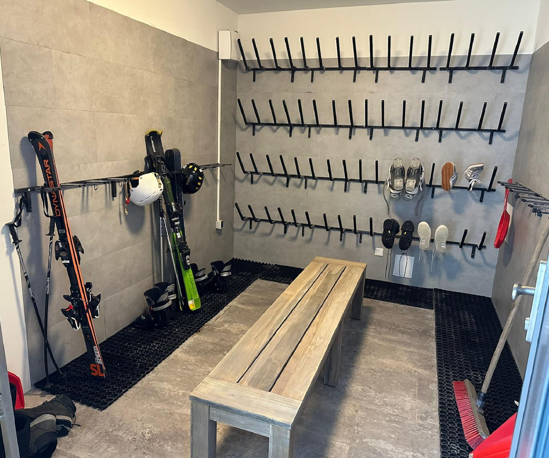 ["Versatile ski holder: Perfect for safe storage of skis, ski poles, Nordic walking poles, as well as additional accessories such as gloves, jackets or backpacks", "High quality protection: Equipped with rubberized hooks, the holder reliably protects your ski equipment from scratches and damage", "Optimal organization: With a generous total length of 83 cm and 14 cm long arms, the holder offers space for multiple equipment items - ideal for garage or basement", "Robust construction: Made of durable, powder-coated steel with a maximum load capacity of 40 kg - perfect for long-term use", "Space-saving: Provides a practical solution for ski storage, without taking up much space in the garage or basement"]
