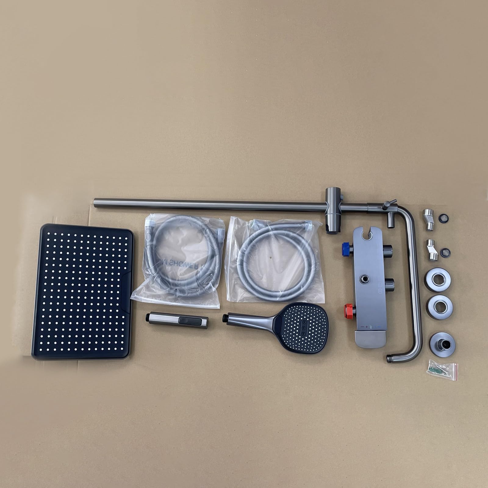 ["【Shower system with constant temperature】It helps protect children and elderly people from scalding caused by sudden changes in hot and cold water pressure. The safe temperature is set at (104°F). With its brass material and elegant look, the body thermostat valve is the perfect choice to add style to your bathroom.","【4 water outlets】2 independently controllable by turning, overhead shower/hand shower/bidet outlet/bathtub faucet, each water outlet has a corresponding switch and the rotating function clearly marks the water outlet mode","【High-pressure shower head】32 x 22 cm rain shower head, silicone water outlet, self-cleaning needle automatically pops out, uniform water flow without clogging. 360° swivel adjustment to adjust the comfortable water exit angle. The hand shower has three adjustable settings including rain, mist, and pulse","【Multifunctional】The hidden waterfall nozzle can quickly fill the bathtub, improving not only the design but also the practicality. The faucet is equipped with an aerator that can filter impurities in the water. Handheld bidet sprayer can solve bathroom toilet, floor drain, mop, and other cleaning tasks.","【Humanized design】The adjustable shower rod can be set to a suitable position based on height freedom level to meet the showering needs of different family members and make showering more comfortable. 59-inch PVC shower hose, targeted cleaning during bathing, convenient for children and pets to clean after bathing, feel free to contact us with any questions"]