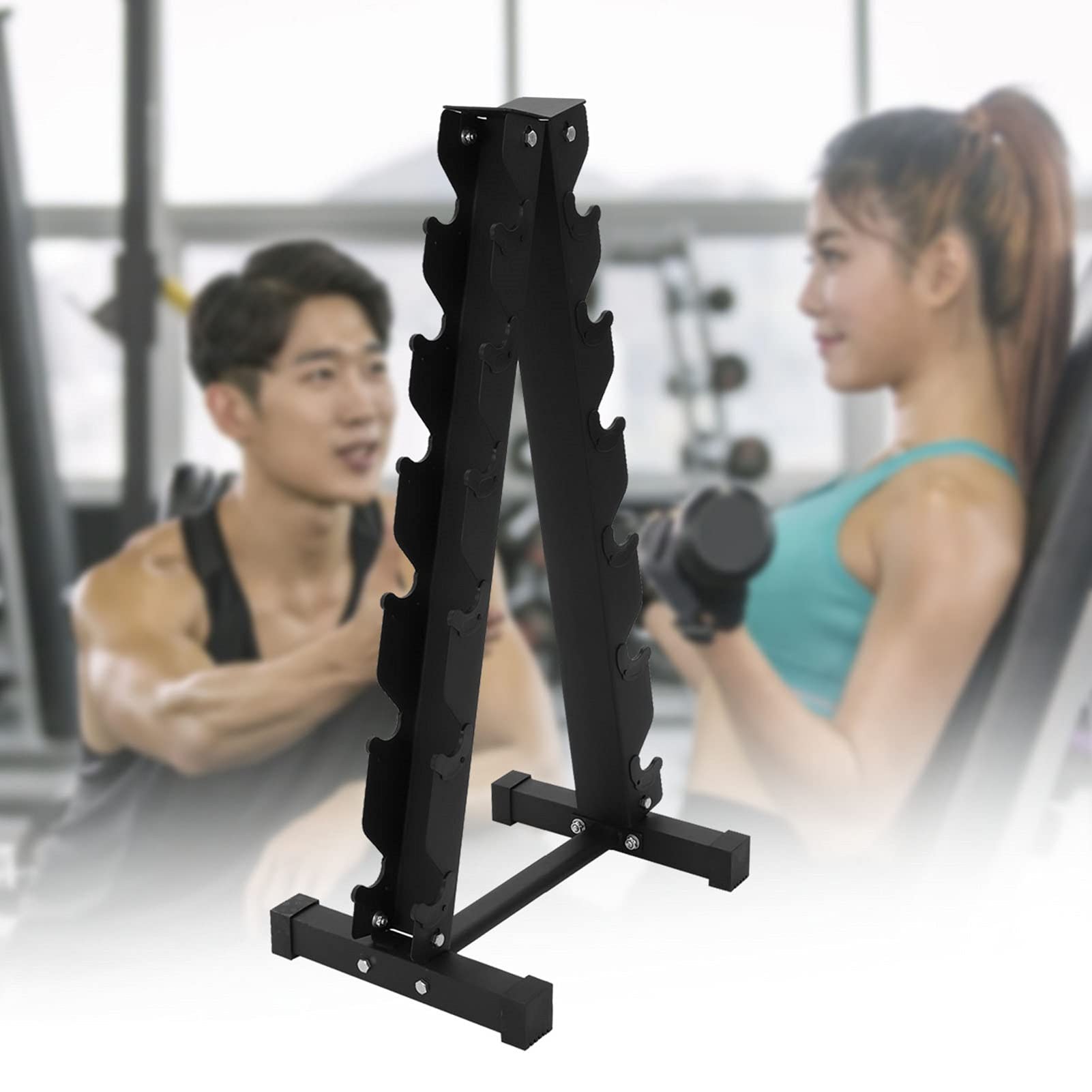 ["High-quality Material] This dumbbell rack made of cast iron and super powder-coated steel construction is durable, strong, and wear-resistant, waterproof and moisture-proof, not corrosion-resistant, and has smooth, rounded edges.","[Strong Carrying Capacity] This dumbbell rack is made of a sturdy steel construction and can hold up to 300 kg, which not only protects the coated handle of the dumbbell but also makes it easier to place the dumbbell.","[Non-slip Rubber Feet] Strong vertical dumbbell rack with non-slip rubber feet. Scratch-resistant and safe. Rubber pads prevent damage to your dumbbells. Rubber end caps on the dumbbell stand prevent damage to the floor. These dumbbell racks protect your dumbbells and the floor equally.","[Unique Design] This dumbbell rack features an A-shaped triangle for extra stability and can accommodate up to 12 different types of dumbbells. It takes up very little space and gives you more room to workout. It also prevents dumbbells from rolling and damaging other items.","[Wide Range of Applications] This dumbbell weight stand is designed for indoor use and takes up the smallest volume in your home, suitable for bedrooms, living rooms, offices, gyms, and more."]