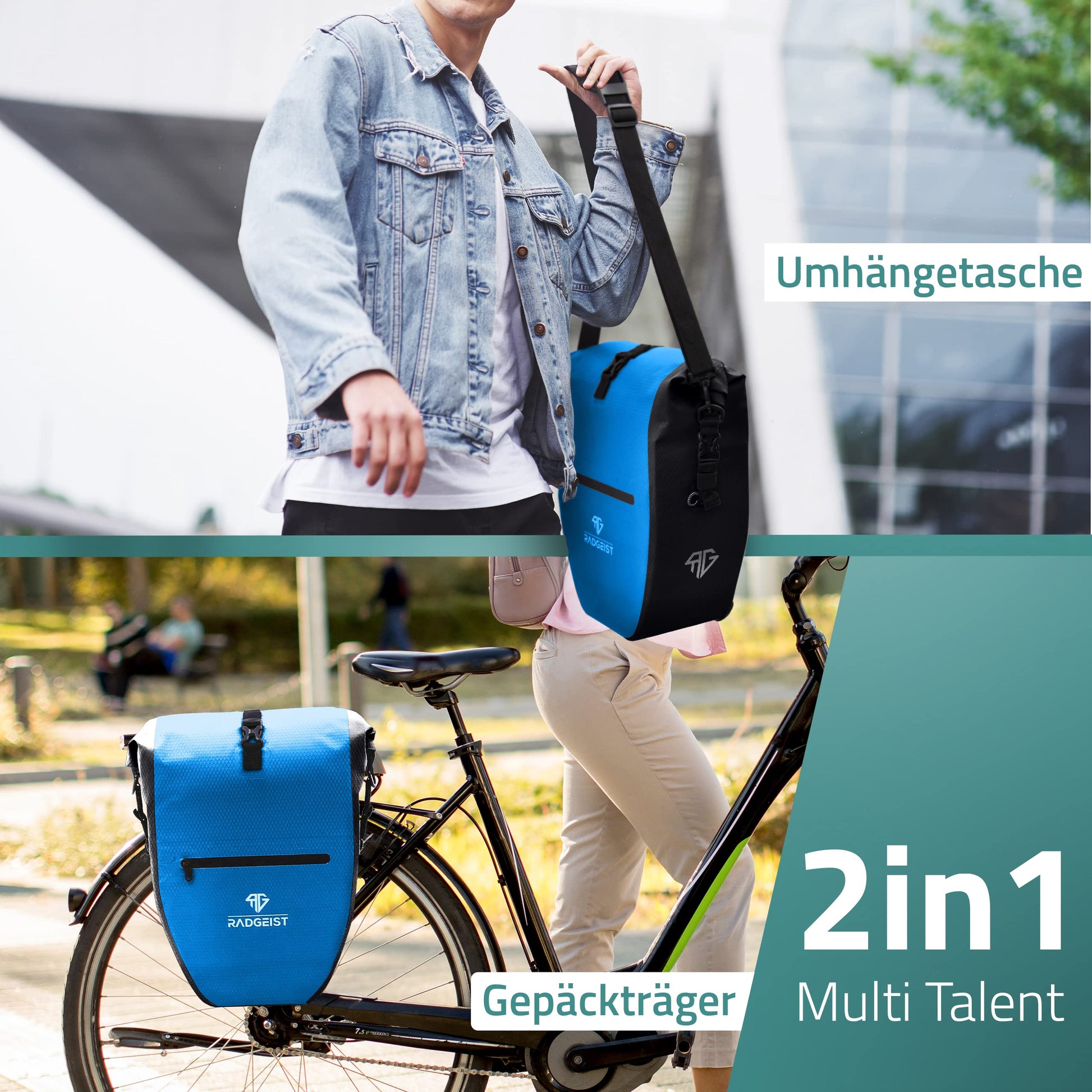 ["2in1 FUNCTION - Luggage carrier & shoulder bag: The Radgeist pack bag can be flexibly used as a side bag for the bike or as a comfortable shoulder bag for everyday use - ideal for commuters, tours or city strolls.","100% WATERPROOF & ROBUST: The rear bag protects your contents in any weather - made of durable material and with welded seams for maximum durability.","28 LITERS OF STORAGE SPACE & THOUGHTFUL DESIGN: Large main compartment with additional inner pocket & outer pocket for quick access - your bike bag offers plenty of space for shopping, work materials or excursions.","PRECISE FIT & SECURE HOLD: Suitable for luggage carriers with 8-16 mm diameter. The adjustable mounting system ensures a secure fit - even on bumpy paths.","REFLECTORS & MANY COLORS: Integrated reflectors ensure visibility in traffic. Available in two sizes and several colors - so the bag visually and practically matches any bike.","WE ARE HERE FOR YOU - RADGEIST Service: As a young start-up, we develop our products with a lot of passion and a clear focus on quality & functionality. If you have any questions or problems, our customer service is personally there for you - fast, uncomplicated and reliable."]