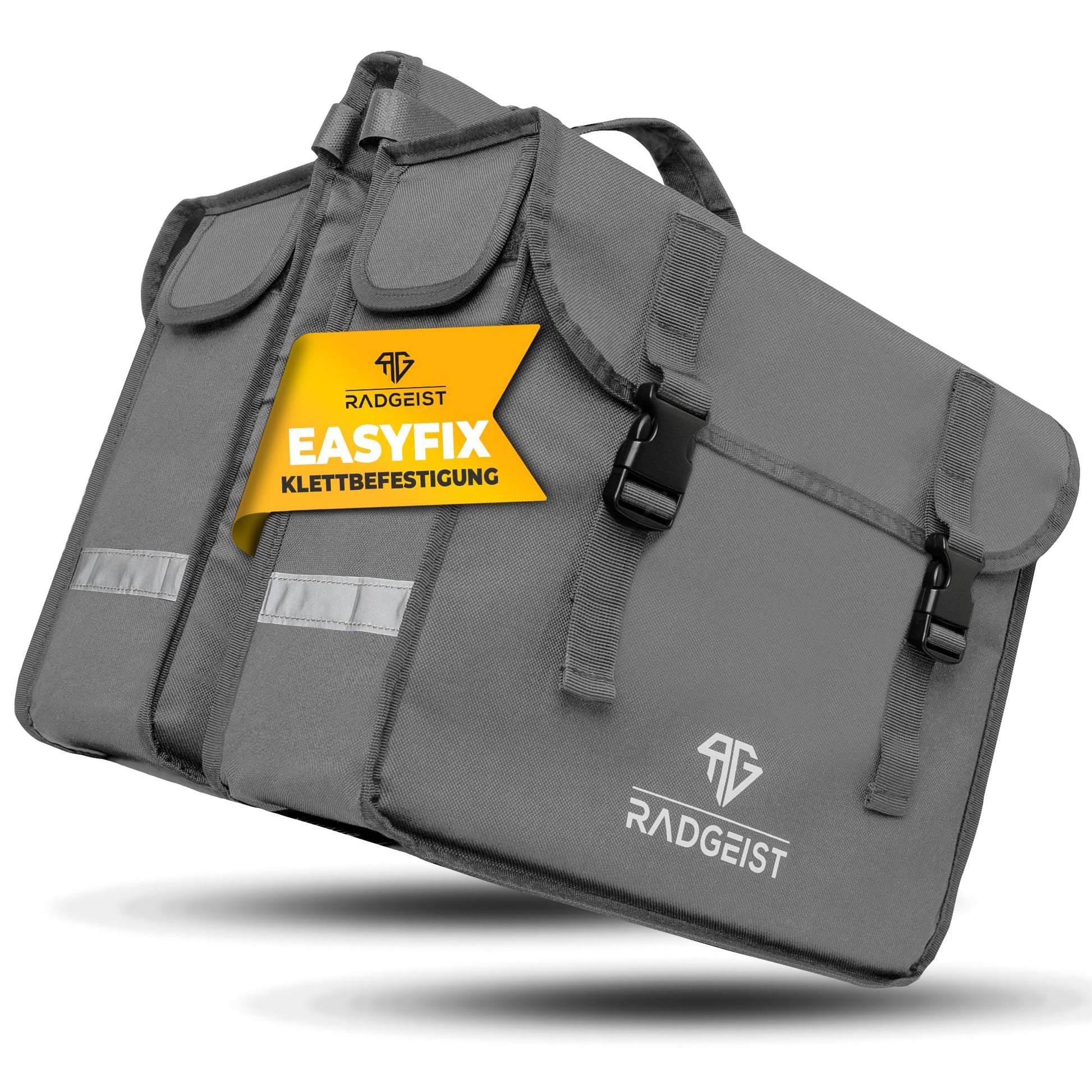 "Easy attachment to the bike - The Radgeist double bag can be easily attached to the bike with the help of adhesive tapes and is suitable for all common luggage carriers. With an additional fixation, the double bag sits securely and firmly on the bike."