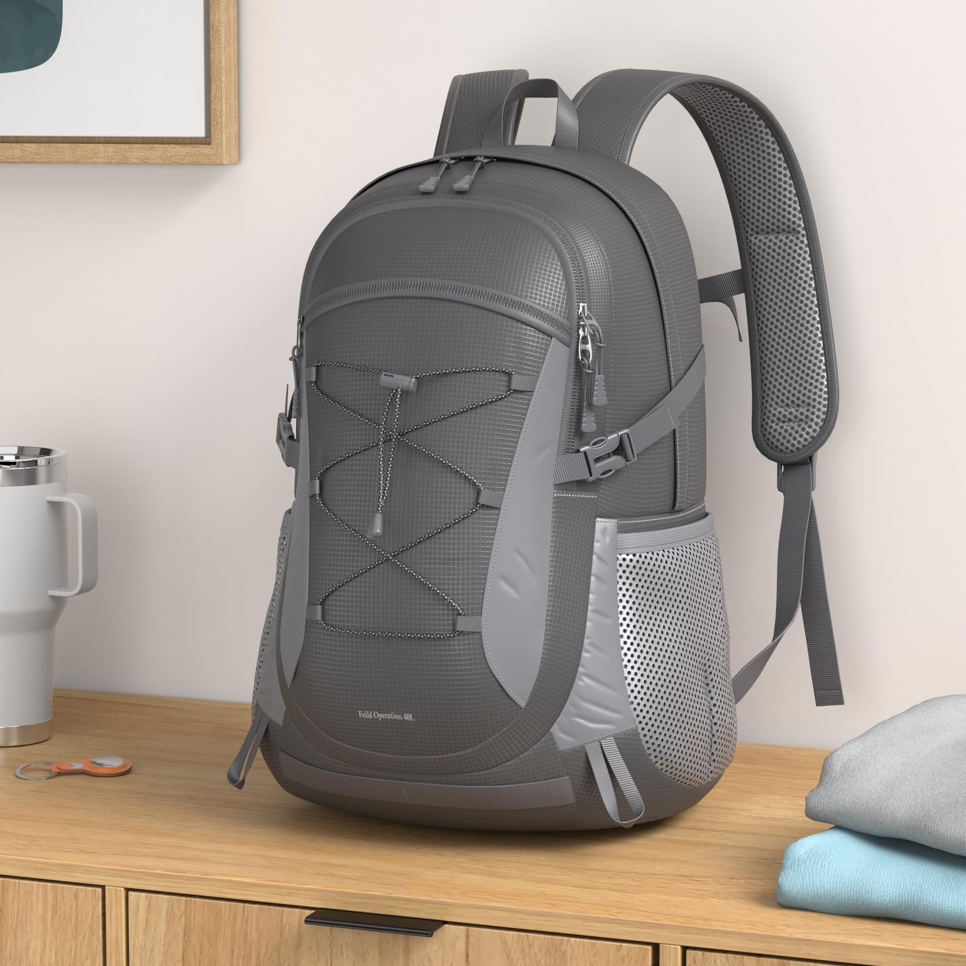【Large Capacity】: This foldable 40-liter travel backpack features a main zippered compartment, two front zippered pockets, two side mesh pockets, and a waterproof PVC back pocket for separating wet and dry items. The spacious pockets keep everything organized, such as tents, trekking poles, laptops, clothes, and more.