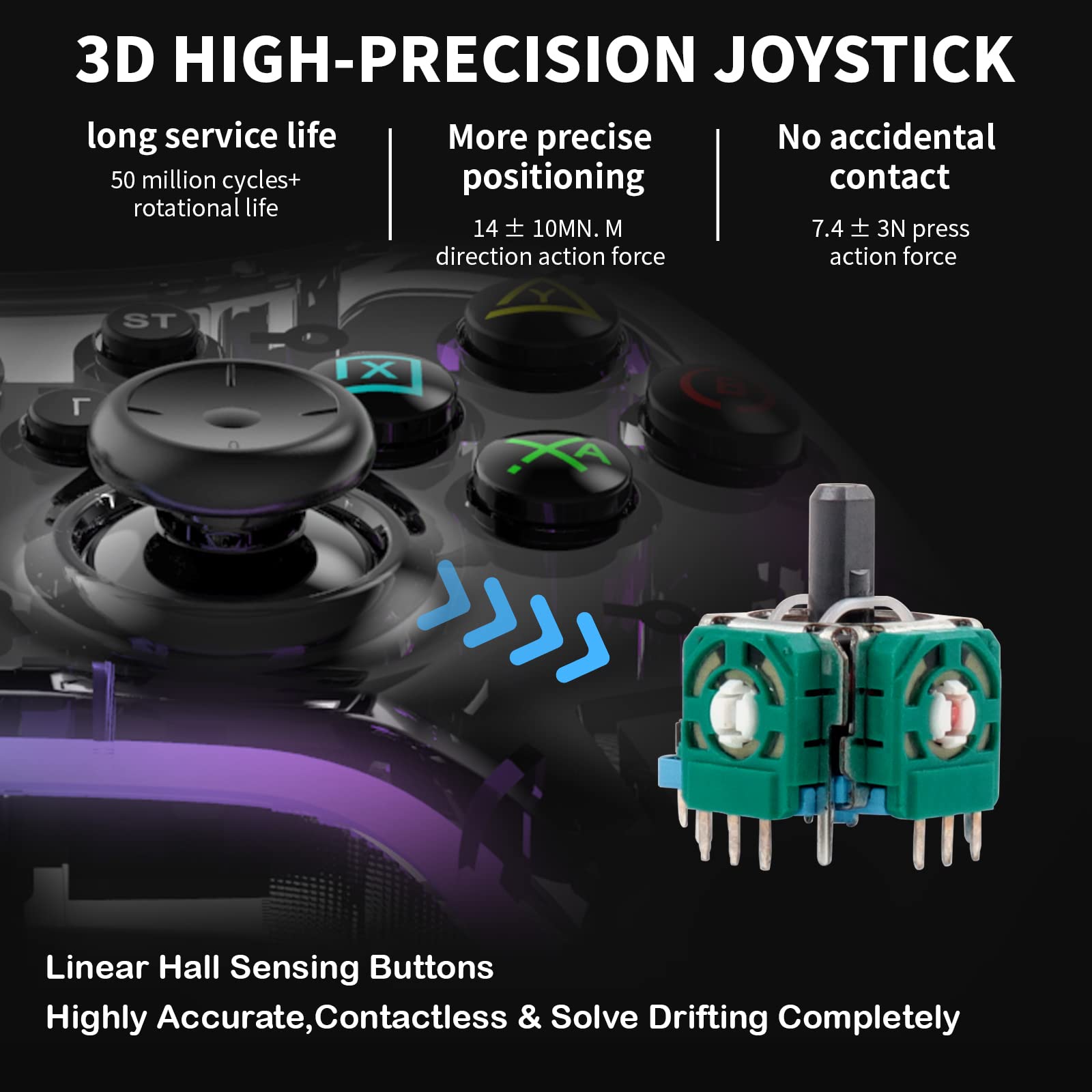 "Experience a revolutionary gaming experience with our wireless controller. Our advanced ALPS joysticks and Hall sensor buttons offer unparalleled performance with a lifespan of 50 million clicks and no dead zones or drift. The ergonomic design includes sweat-resistant and comfortable grips, perfect for longer gaming sessions.",