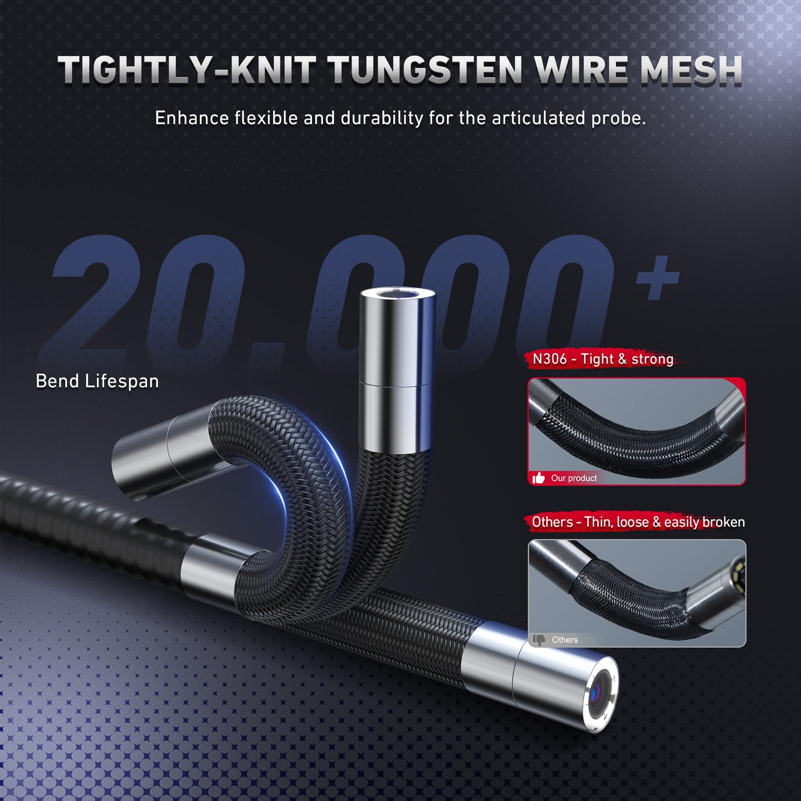 ["210° rotatable probe, innovative design"] The probe of the endoscope can be rotated a full 210°. The ultra-fine 19-in-1 stainless steel wire provides excellent durability and tensile strength for endoscopes, effectively preventing tissue from breaking or being damaged. Ensures long-term product stability and allows for easy adjustment of the viewing angle for rotation.