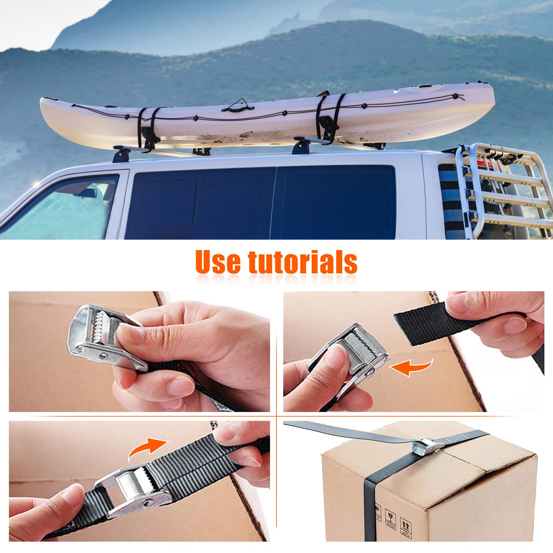 ["STRONG LASHING FORCE -- The ratchet tie-down strap is 2m, 5m, 10m long and 25 mm wide enough to transport most goods. Whether large furniture or other items are being transported, it can provide the best fixation under all circumstances to avoid scratches and damages to the items.","WIDELY USED -- The fastening strap is suitable for bike racks, car trunks, cargo and luggage transport, as well as camping, beach, skiing, outdoor sports, and other excursion activities. It can ensure that the carried items are not damaged or dispersed.","EASY TO USE -- The easy-to-use metal buckle is convenient for everyone (including children) to use. The length can be scaled arbitrarily, so you no longer have to worry about the safety of the cargo. Even if the suitcase is open, you can securely tie and transport the load.","DURABLE MATERIAL -- The ratchet tie-down strap is tightly woven from polyester fibers and the buckle is made of strong metal. Corrosion resistance, good resistance to deformation and aging, can carry a weight of 250KG and can be repeatedly used.","BUNDLE SET -- The set includes 6 tie-down straps that can be used alternately. Comes with a high-quality kraft paper box that is easy to store. When not in use, you can place it in the paper box to avoid losses."]
