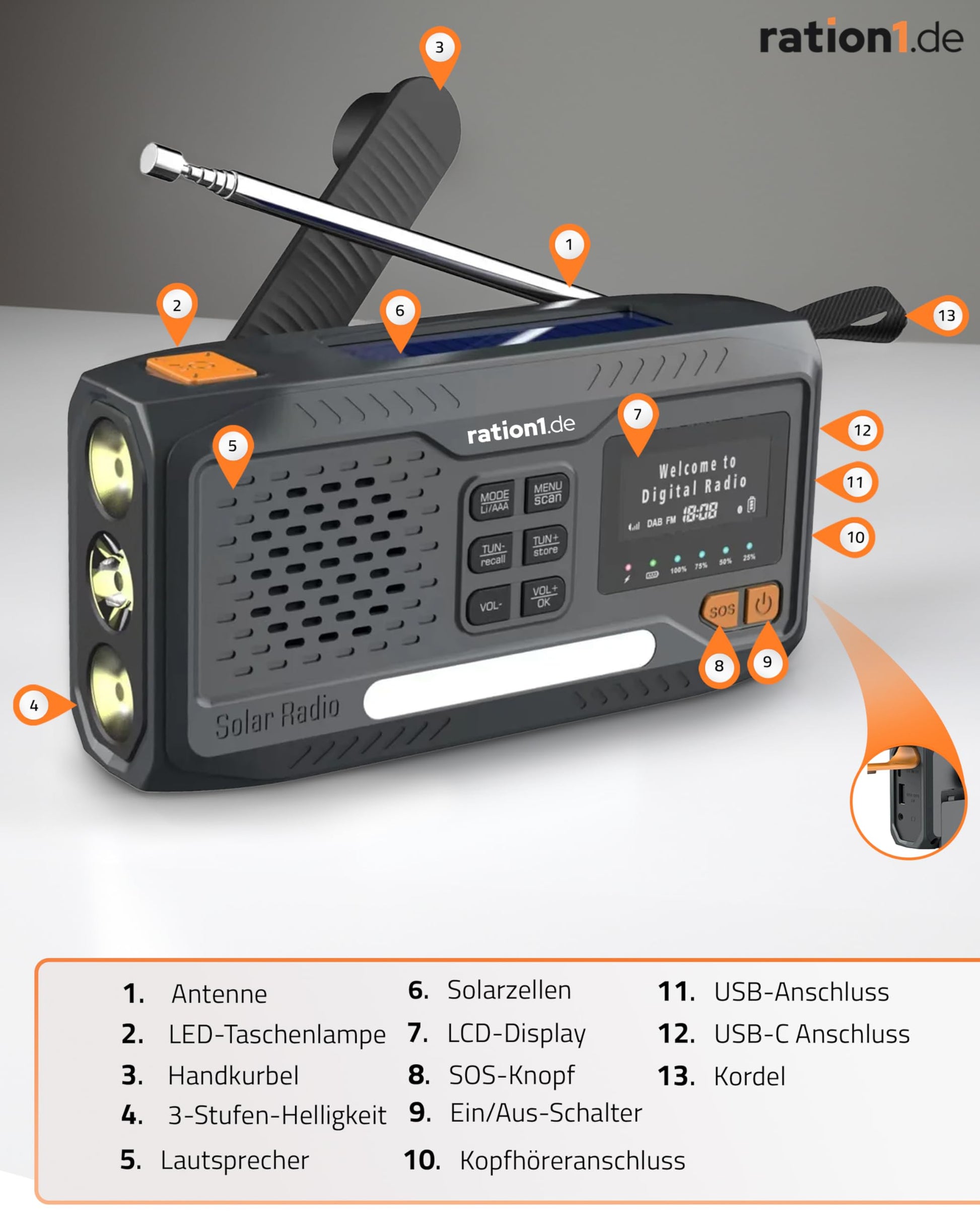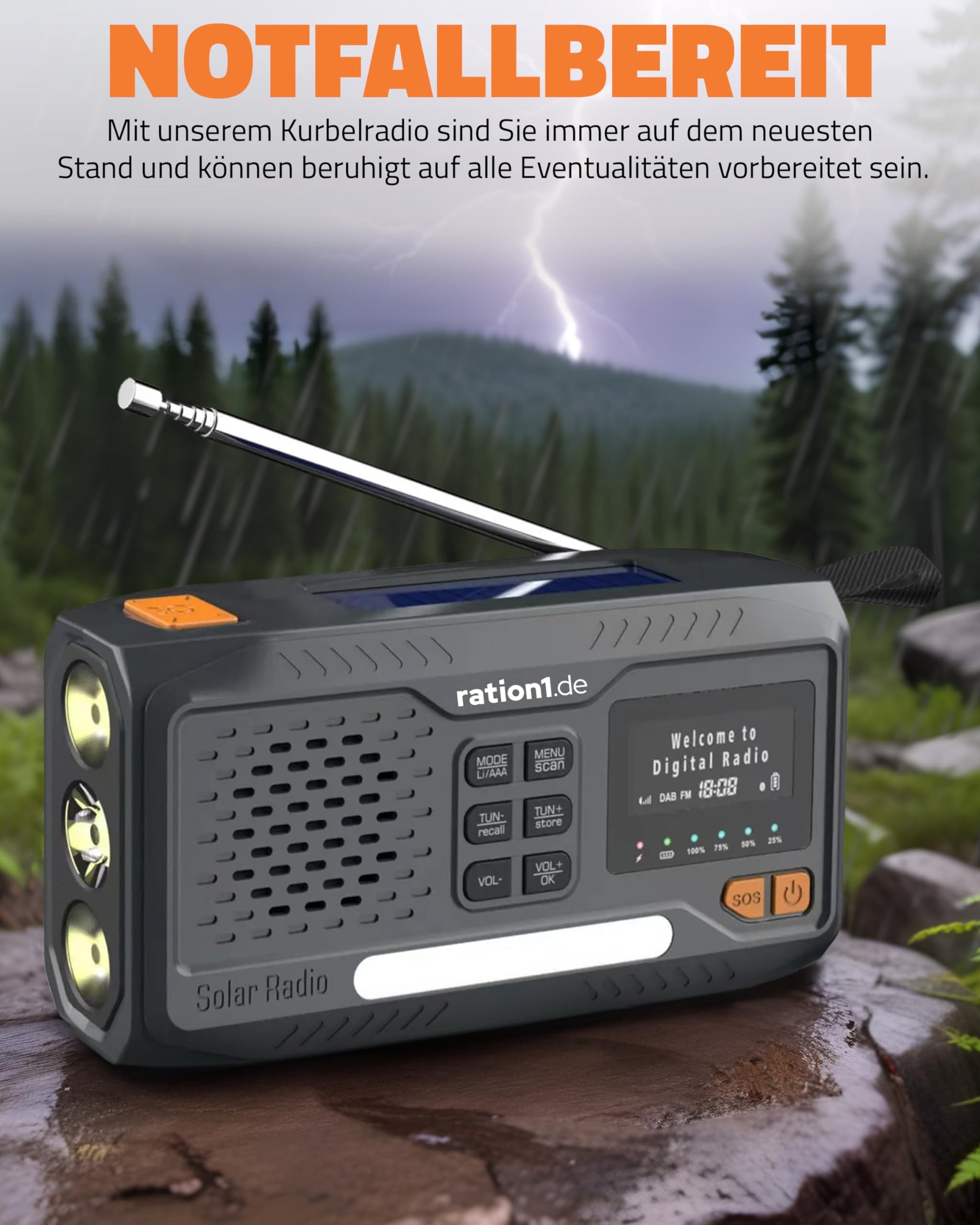 ["RECIPIENT: DAB+ and FM radio stations, stores up to 40 favorite stations, equipped with LCD display and extendable telescopic antenna. Stay informed at all times","MULTIPLE POWER SUPPLY: 2000mAh rechargeable battery by hand crank (400mAh), solar panel (80mA), USB-C (5V/2A) or 3 AAA batteries (not included). Ideal for outdoor, camping trips, survival gear or survival kit","COMPACT DESIGN: Dimensions 15 x 7.5 x 4 cm, weight 260g, rugged construction ideal for hiking, camping or as a construction site radio","EMERGENCY FUNCTIONS: Bright LED flashlight with COB technology, separate reading light, SOS emergency signal with alarm and light function. Good visibility in dark environments, perfect for outdoor equipment or during power outages","MULTIFUNCTIONAL: 3W speaker with Bluetooth v5.0, USB-A port for charging external devices, 3.5mm headphone jack, equalizer and sleep function. Attract attention in emergencies with the SOS function. A loud alarm and an emergency signal by light go off. Receive important weather alerts & news via the world receiver radio"]