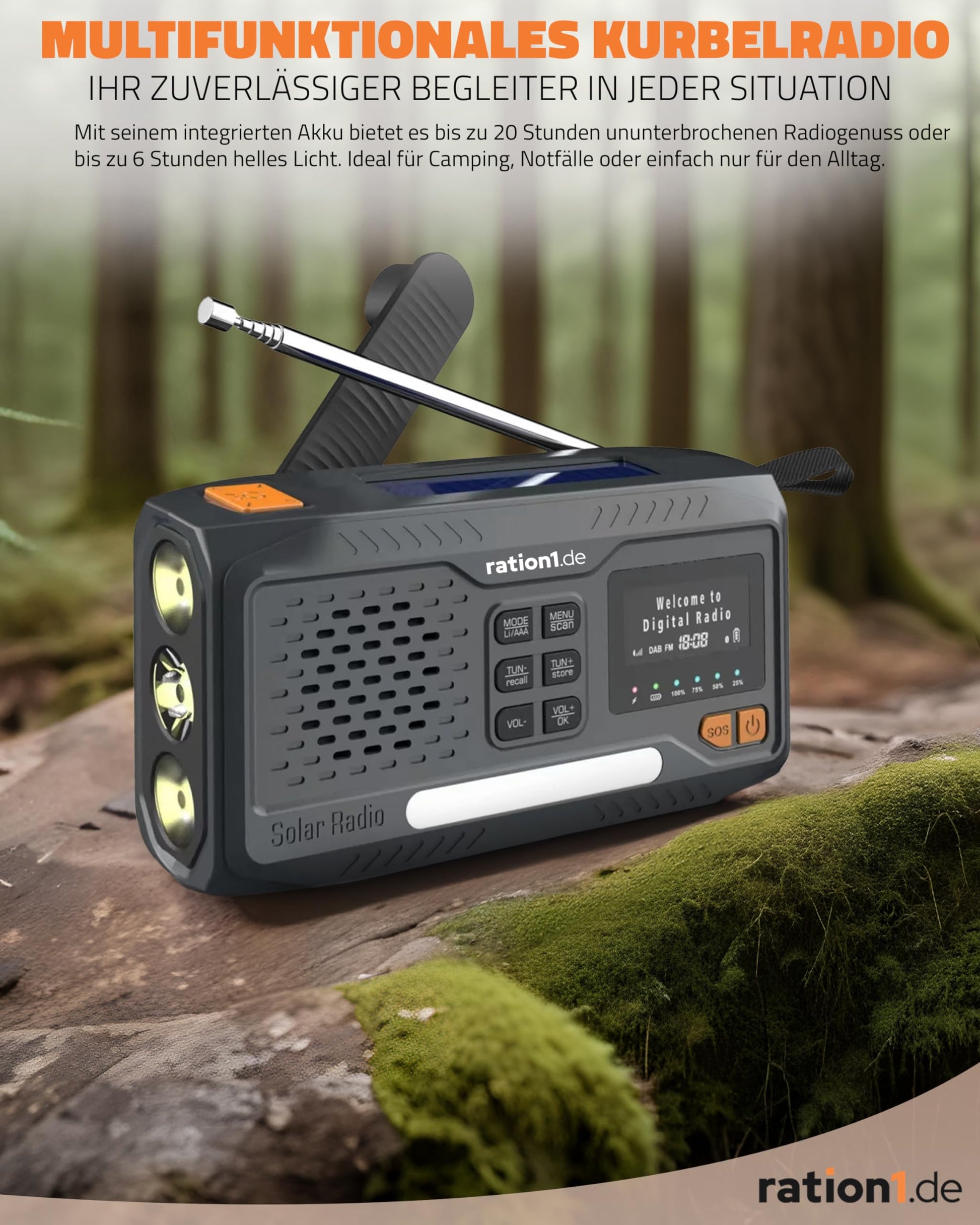 Ration1 crank radio DAB+, portable solar radio with LED flashlight, 2000mAh power bank, hand crank, SOS function, Bluetooth, USB-C, for camping and emergency situations.