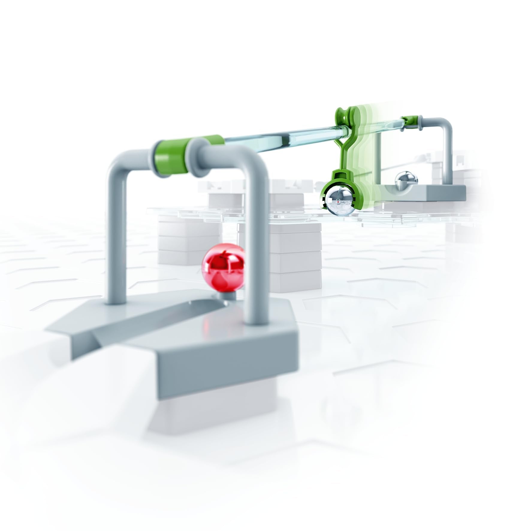"Product 1: Combined with any GraviTrax Starter Set, the trampoline ensures an even longer and more exciting playing experience. When a ball rolls onto the trampoline, it jumps impressively higher. This allows obstacles and height differences to be overcome impressively.",