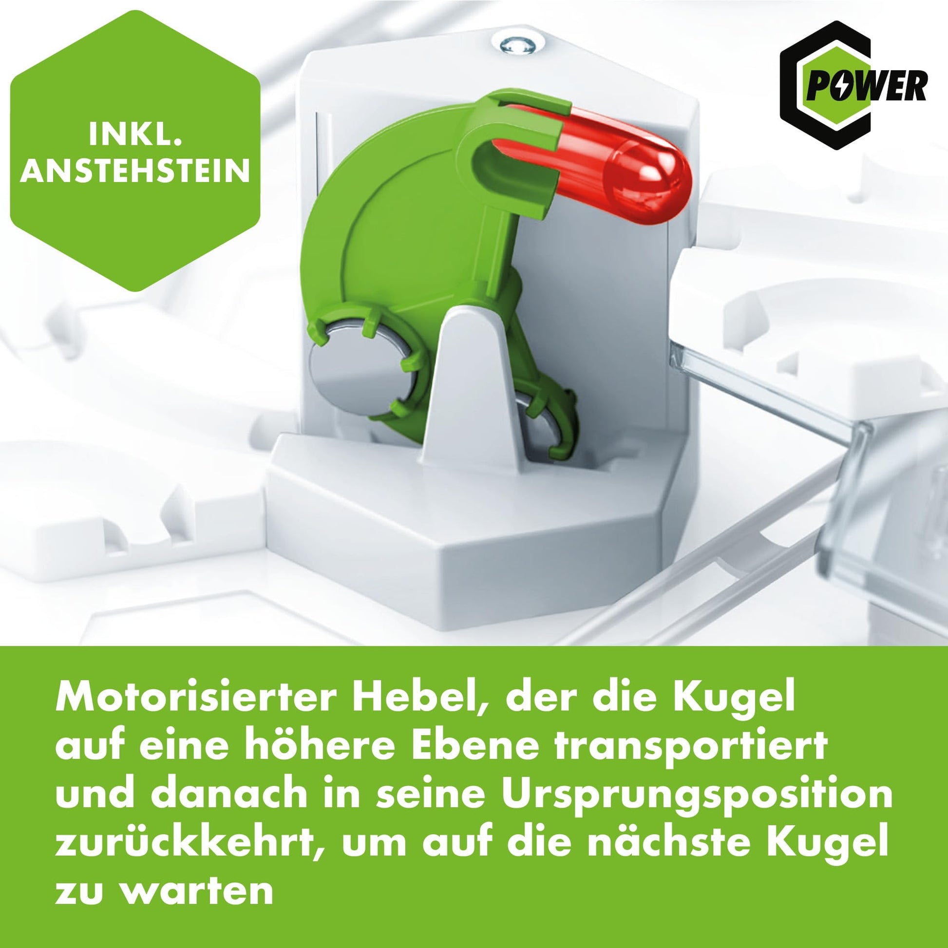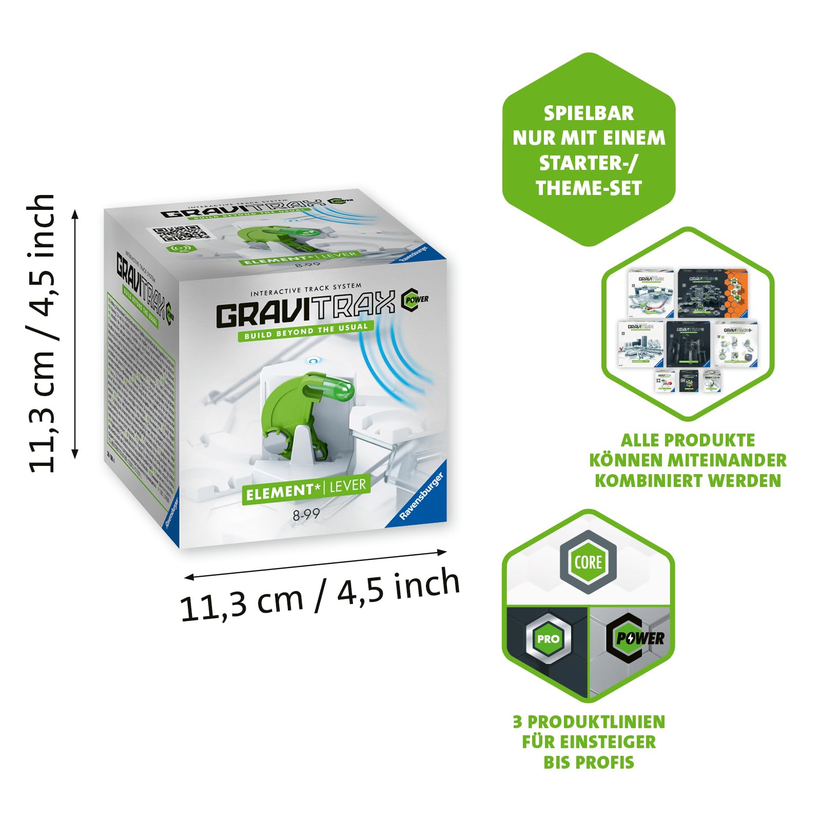 ["The electronic GraviTrax POWER Action-Stein Lever is an expansion that lifts balls up and adds height to the action on the Ravensburger marble run system.","The Lever connects two levels of the track by lifting balls up before resetting automatically. Multiple balls can pass through the Lever, gaining speed through height and running the track again on identical or new paths.","The GraviTrax POWER Element Lever can be combined with all starter sets, expansions, and action stones. GraviTrax, GraviTrax PRO, or GraviTrax Power: The Ravensburger marble run system offers limitless creative and combination possibilities.","The Lever requires 2 AAA batteries, which are not included in the packaging. Rechargeable batteries can be used.","The system approach of GraviTrax with starter sets and expansions across three product lines captivates children aged 8 and up, teenagers, and many adults. GraviTrax, PRO, and POWER offer endless possibilities for creative building. An ideal gift not only for birthdays."]