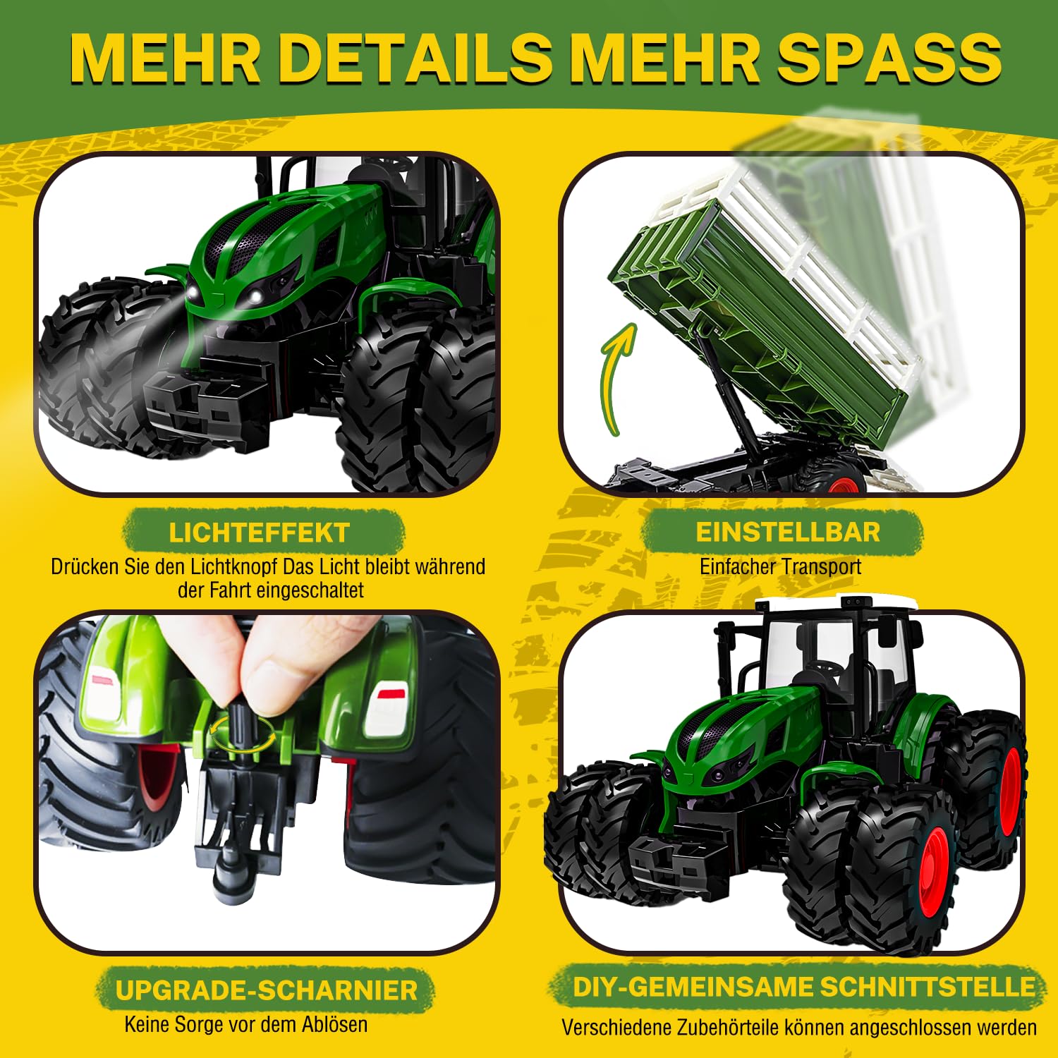 ["100% Complete Tractor with Remote Control"] The remote controlled tractor from 4 years comes with 2.4G remote control, batteries, charging cable, extension trailer, cow, and German instructions. The cow is lively and fun, the trailer is detachable, and the cargo container can be raised and lowered, allowing young agriculture fans to simulate the entire process of loading and unloading livestock, transportation, and unloading the cute cow, all by themselves.