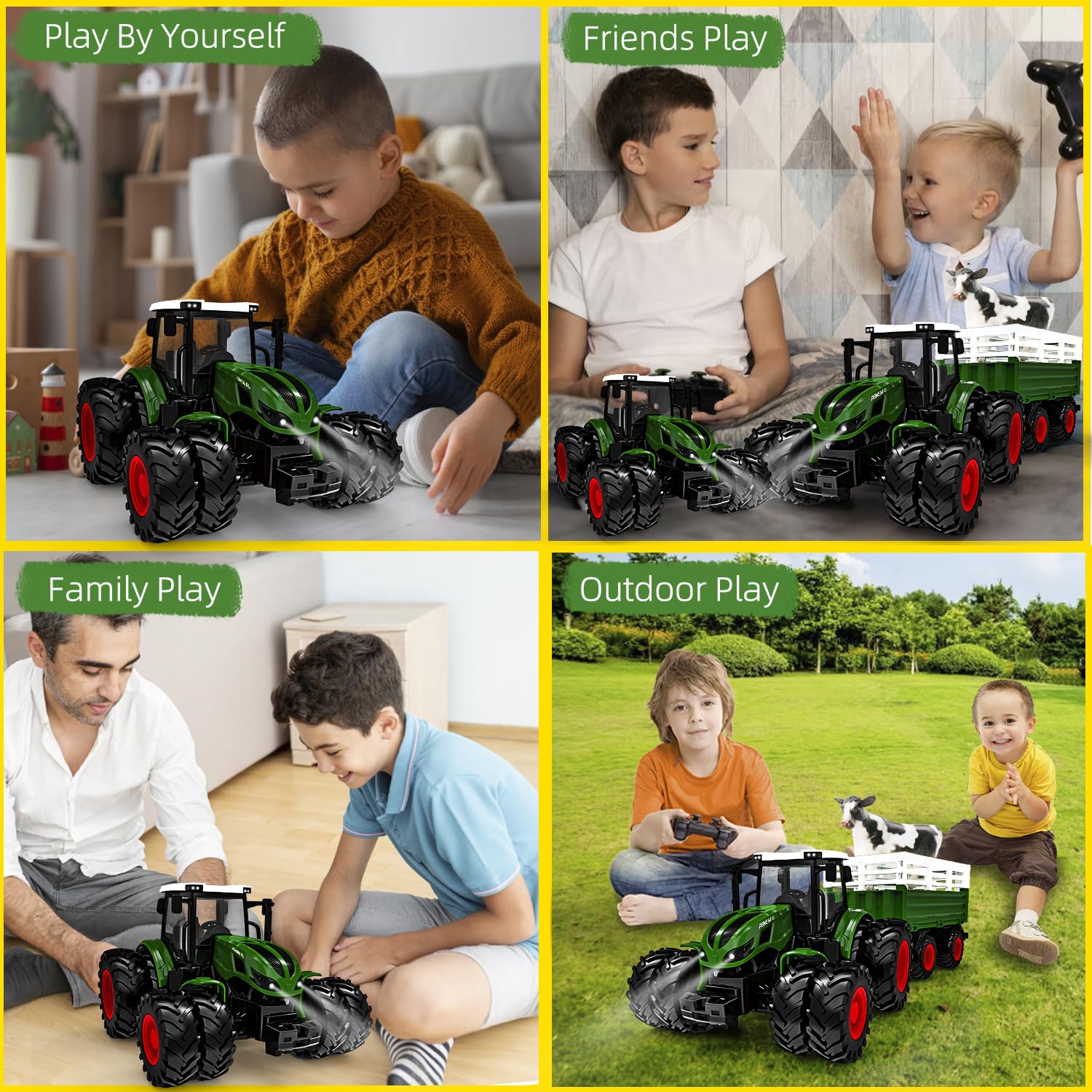 ["Highly Simulated Remote Control Tractor"] The RC tractor remote controlled from 4 years is equipped with many details based on the latest technology. The tractor toy from 3 years presents itself in bright colors, with interior mechanisms, exquisite interior details, and a fully equipped interior cabin with simulated seat, steering wheel, console, and a cow.