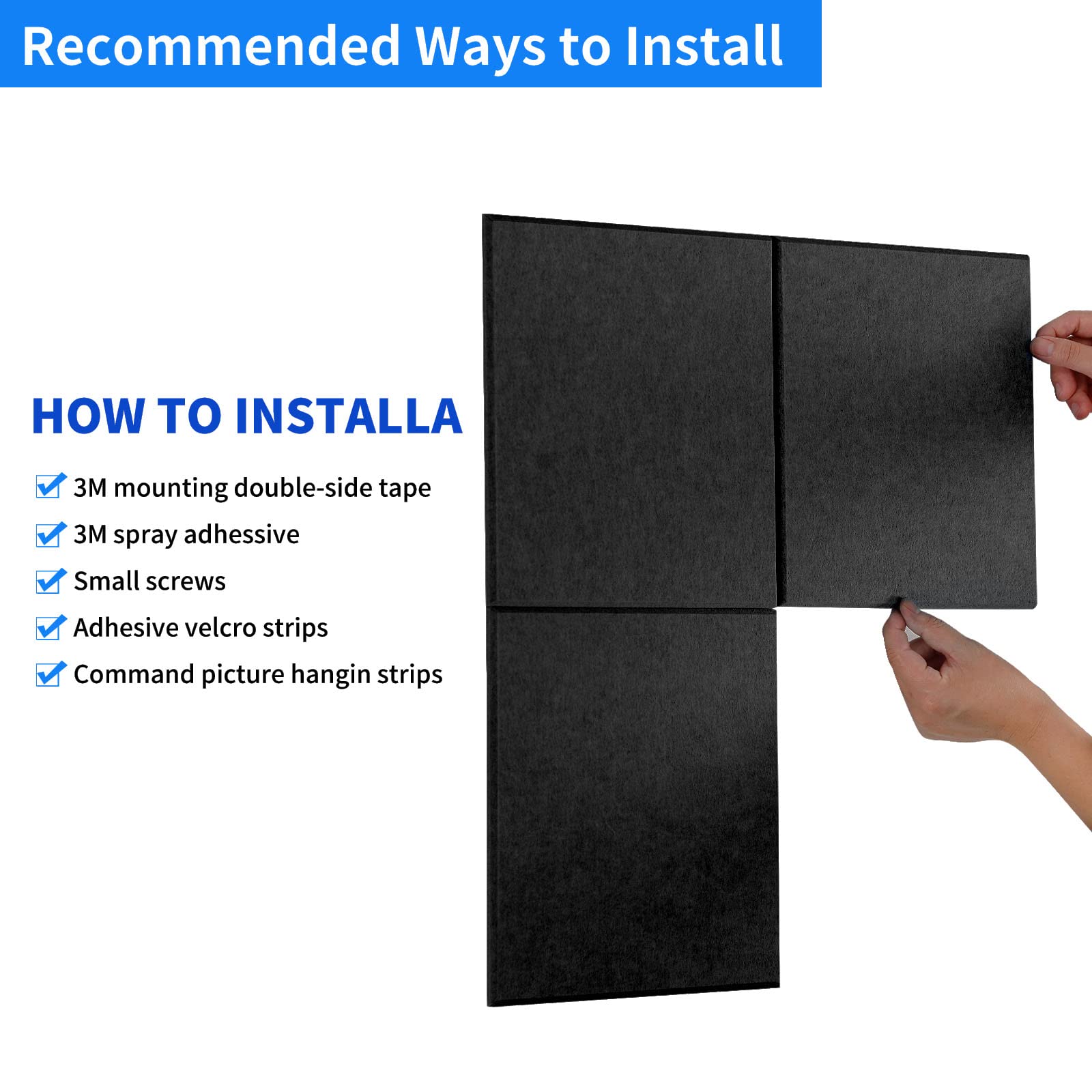 "Easy to install: Our sound-absorbing wall panels are very easy to install. Please make sure your wall is clean, smooth, and free of loose debris or dust before installation. You just need to glue spray adhesive or double-sided 3M tape (not included) to the back of each acoustic panel and then gently press onto the acoustic panel to complete the installation.",