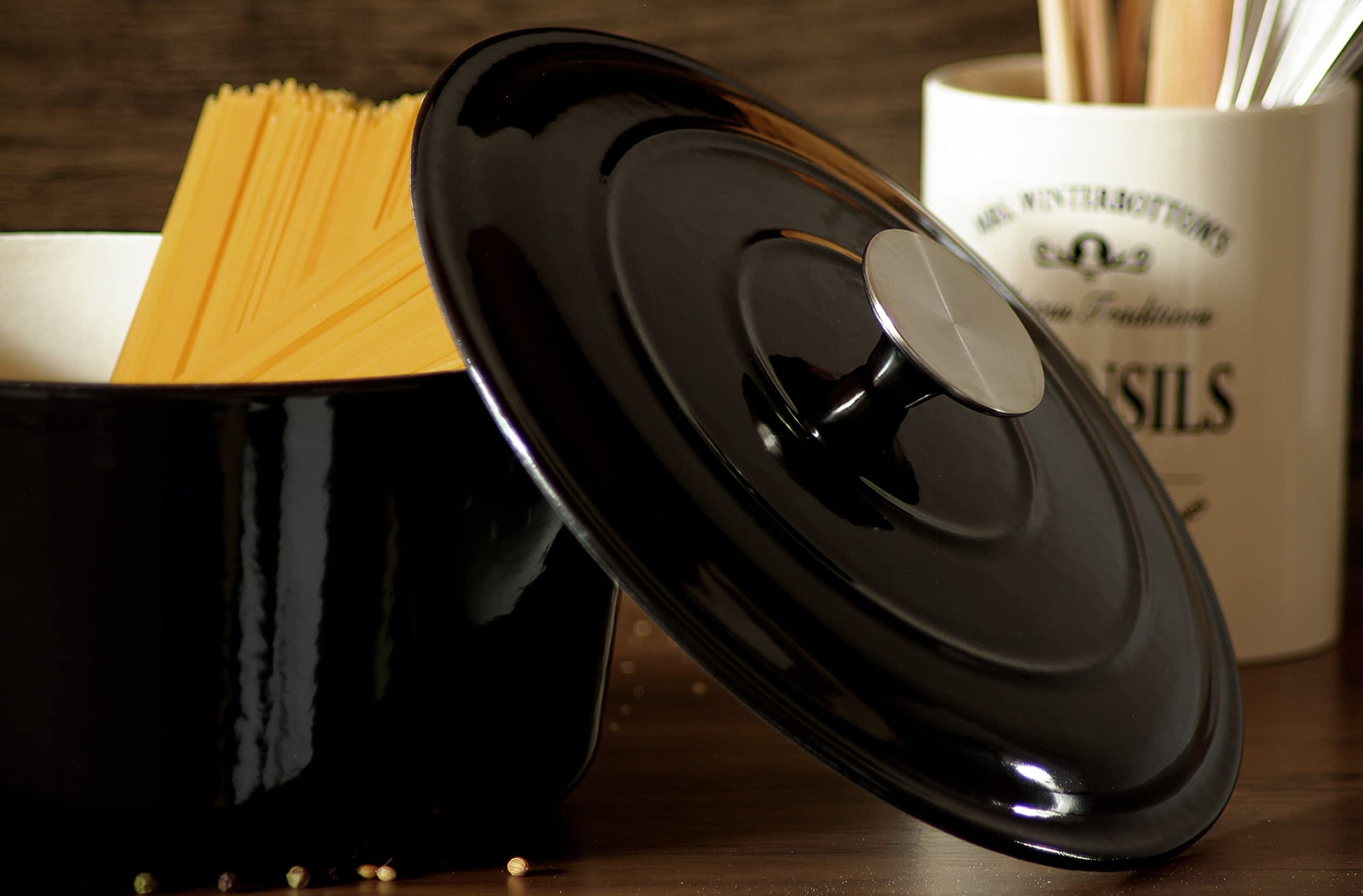 Real Work Dutch oven made of cast iron with enamel coating, cast iron pot, roaster with lid, round bread baking pot, suitable for ovens, grills, BBQs and induction, black, 3.5 L, Ø 22.5 cm, Large
