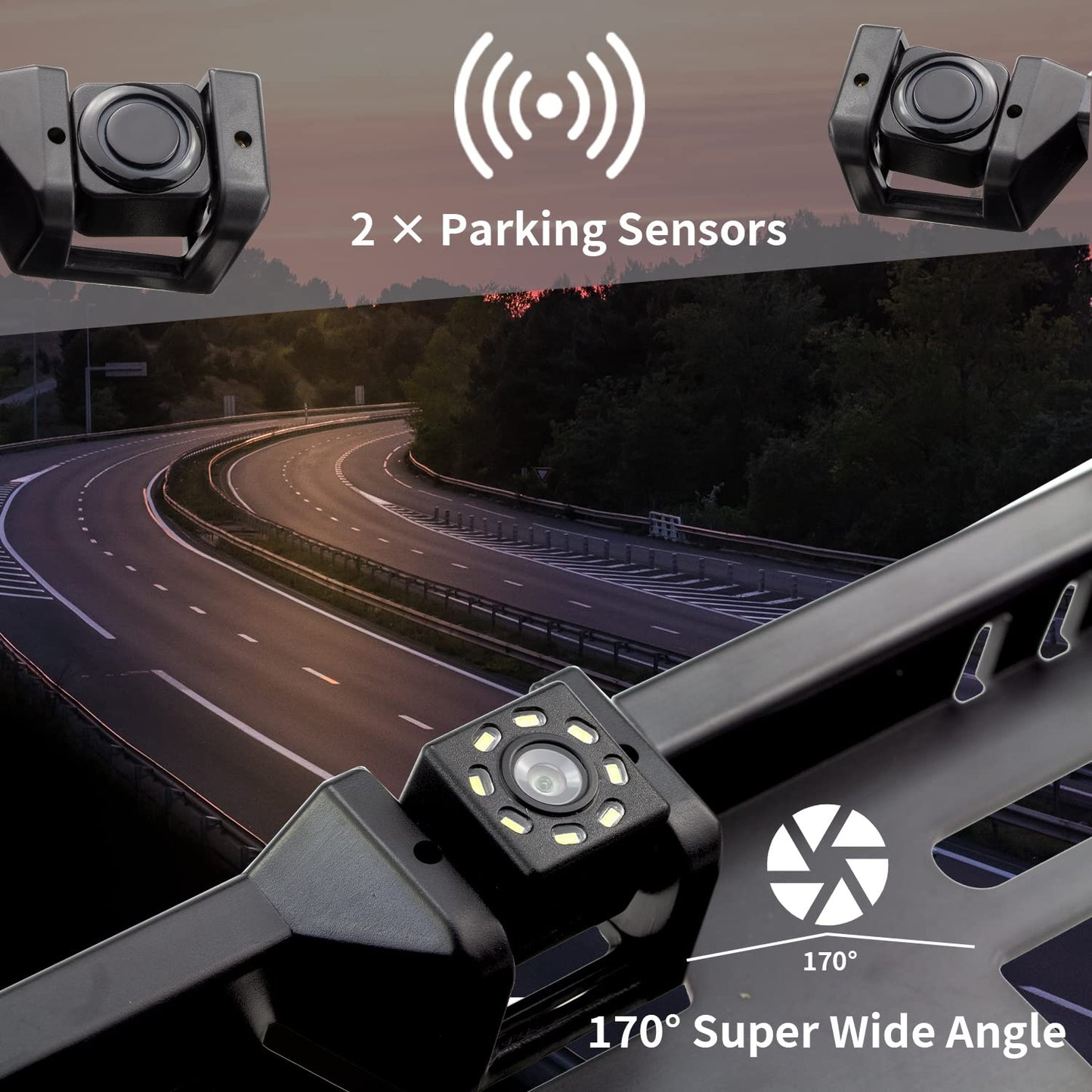 Rear view camera license plate holder with 2 parking sensors + LED distance display, 8 lights rear view camera, 170° wide angle, IP67 waterproof.