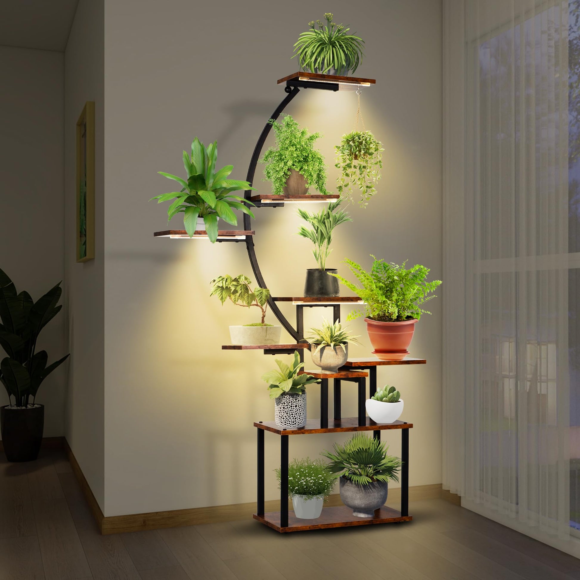 REAWOW Large Flower Stairs with Plant Lamp, 9-Tier Metal Plant Stand for Multiple Plants Wooden Plant Shelf for Indoor Plants, Living Room, Patio, Balcony