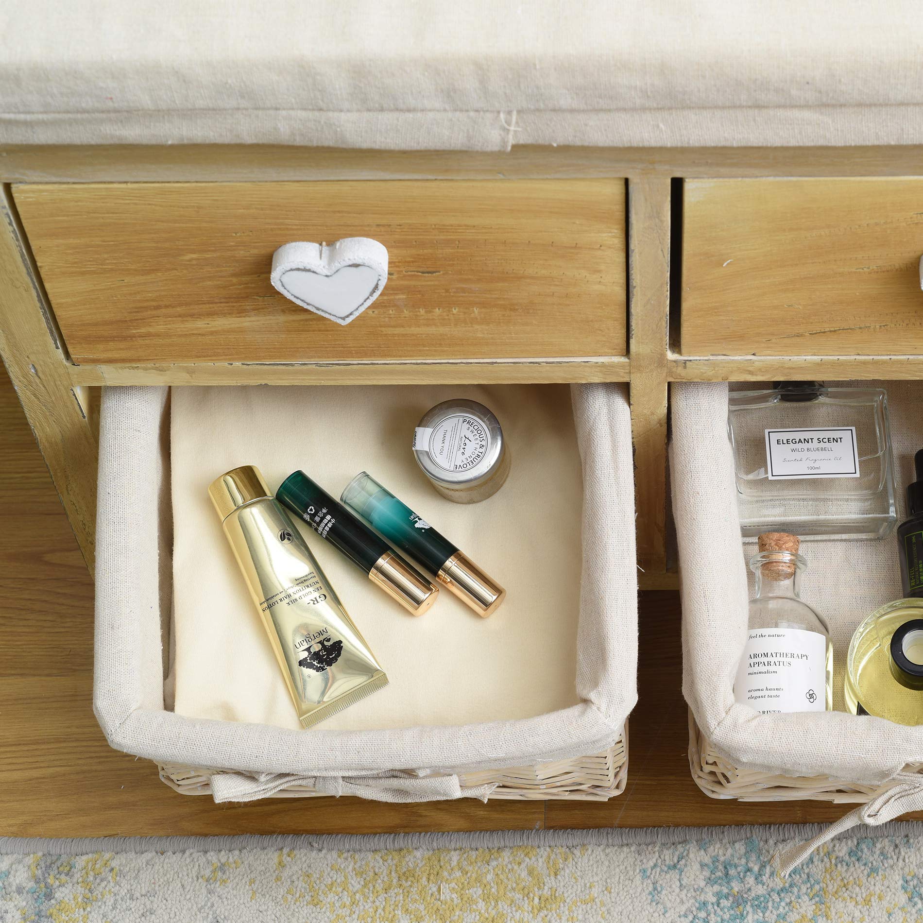 Rebecca wooden bench and wicker baskets, comfortable seat bench with 2 drawers and 2 wicker baskets, beige, shabby chic, for entryway or bedroom - Dimensions: 46 x 60 x 30 cm (HxLxB) - Art. RE4159