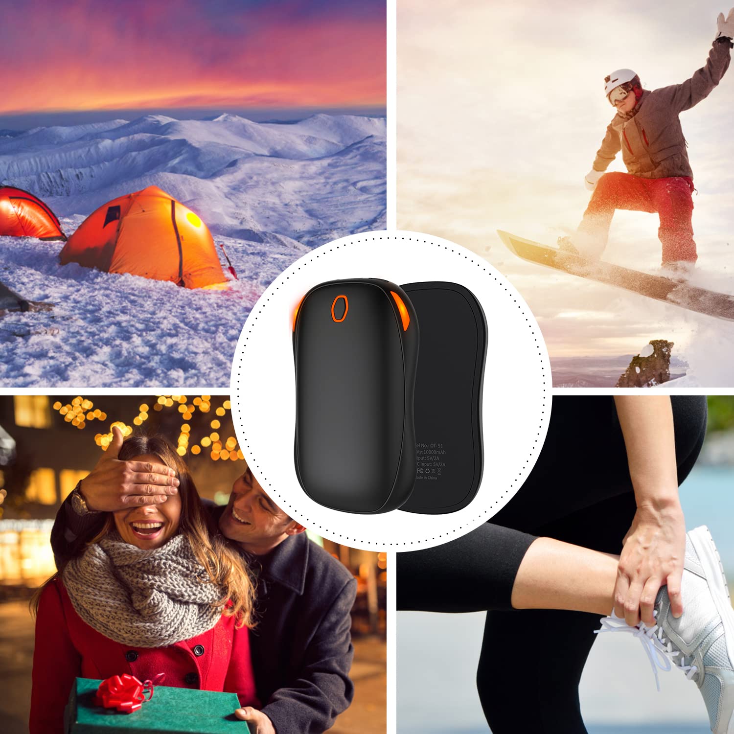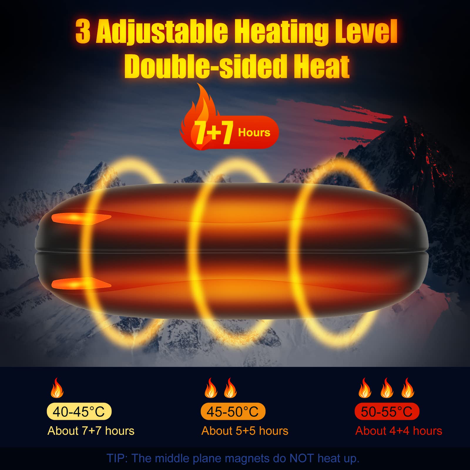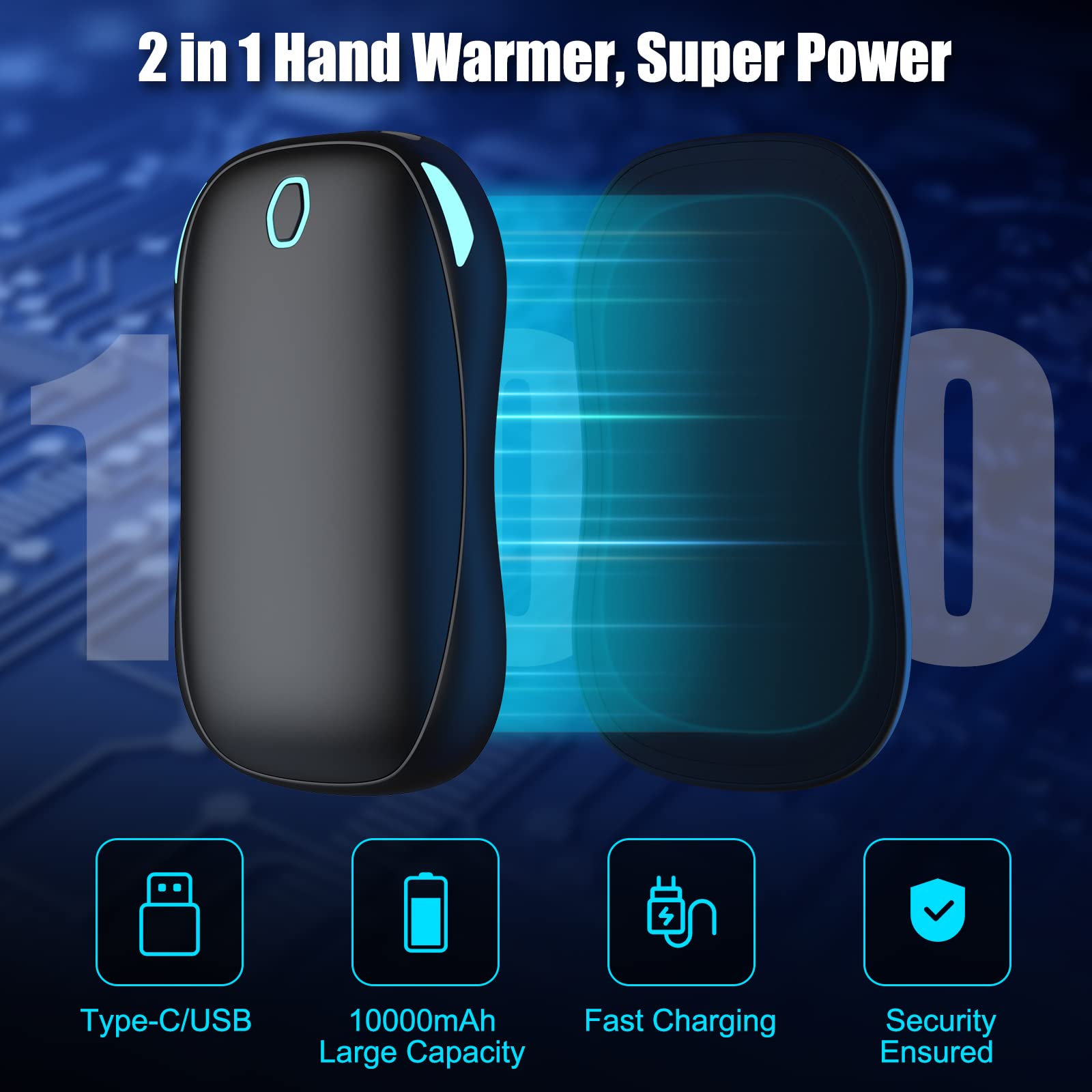 ["Split-type magnetic design: The rechargeable hand warmer is designed with one side for heating and the other side for magnetic absorption. It can be used separately or synthesized. Unique and beautiful shape. It has an ergonomic and comfortable shape that fits well in the hand. Our modern and comfortable hand warmer will provide warmth to you and your loved ones in this cold season.","3 adjustable heat settings: Hold the button for 4 seconds to heat up quickly and deliver warmth immediately. 3 temperature levels, 104-113°F, 113-122°F, 122-131°F to choose from. Charges in 2-3 hours, long-lasting 4-8 hours depending on external environment. (Note: The battery drains faster at higher temperature settings, so battery life depends on how you use the hand warmer.)","Large capacity power bank: With two 5000 mAh lithium-ion rechargeable batteries, USB rechargeable hand warmers with a Type-C charging port and a high-speed 5V/2A transmission. Can be charged quickly. Provides long-lasting reliable heat and can also be used as a power bank to fully charge your mobile phone or other electronic devices in emergency situations when fishing, hiking, camping, or skiing.","Safe and intelligent heating: Applies improved and optimized circuitry for safe use. The built-in NTC overheat protection of the hand warmer, made of high-tech aircraft aluminum and ABS material, features a protection system for shock resistance, anti-scald, anti-slip, and explosion protection. Double safety protection ensures a longer lifespan for the power bank and prevents overcharging, overheating, and short-circuiting.","Winter warm gift: A must-have for the cold winter, you can warm your hands, feet, knees, waist, and stomach in a cold environment. High-frequency vibrating massage and hot compresses can help reduce fatigue and relieve pain. Lightweight, it can be tucked into a pocket or held in hand. Warm your children, seniors, friends in all cold winters! A wonderful gift idea for Thanksgiving, Christmas, Valentine's Day, birthdays."]