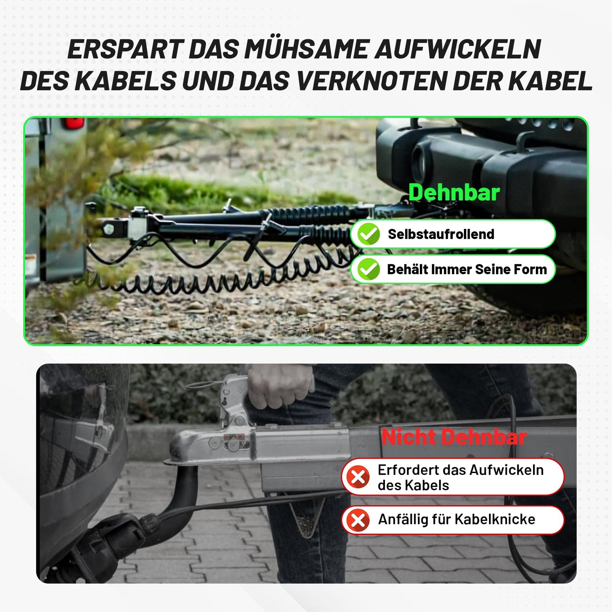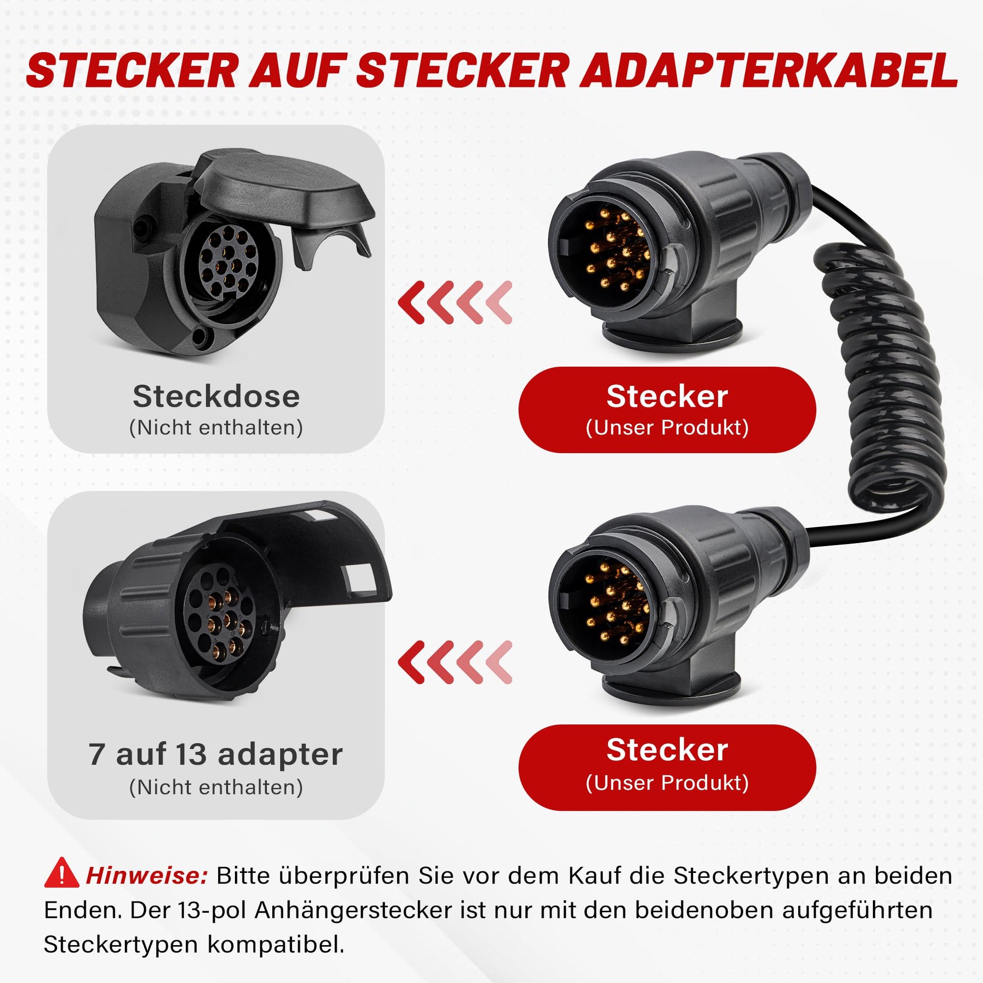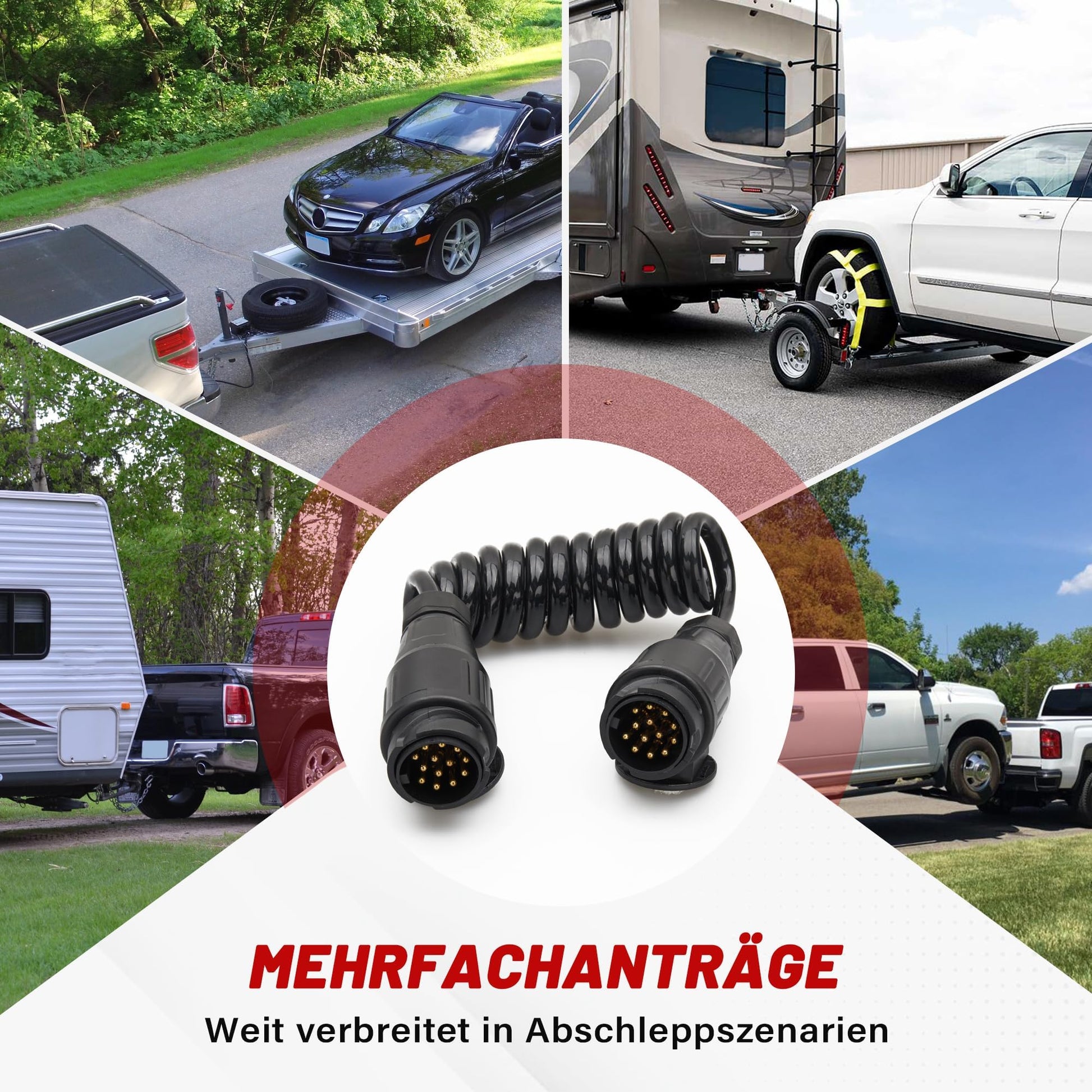 ["Function: The 13-pin plug to plug trailer cable is used to transfer the electronic light signal from the motorhome or caravan to the car/vehicle with 12v power. For both vehicles with 13-pin trailer socket. Suitable for most European cars, trailers, caravans, motorhomes, bike racks, trucks, tractors, vans.","Stretchable Length up to 5.9ft: Made of TPU material, the 13-pin adapter cable has high elasticity and good flexibility. The trailer cable with plug can extend the cable length up to 5.9ft (max. comfortable working length 5.2ft) and spring back to normal length.","Spiral Features Design: The 13-pin trailer spiral cable is self-coiling, keeping the trailer wires off the ground, avoiding wire tangling and knotting.","Great Durability: The RED WOLF 13-pin trailer harness is made of improved, high-quality material for long-lasting durability, waterproof, durable, corrosion-resistant, and not easily deformed. Pure copper wire for stable and low-loss electrical signal transmission.","Easy Installation: Plug and play. You don't have to cut wires. The retractable 13-pin trailer cable can safely fit into both trailer sockets. The cable tension prevents the plug from being detached."]