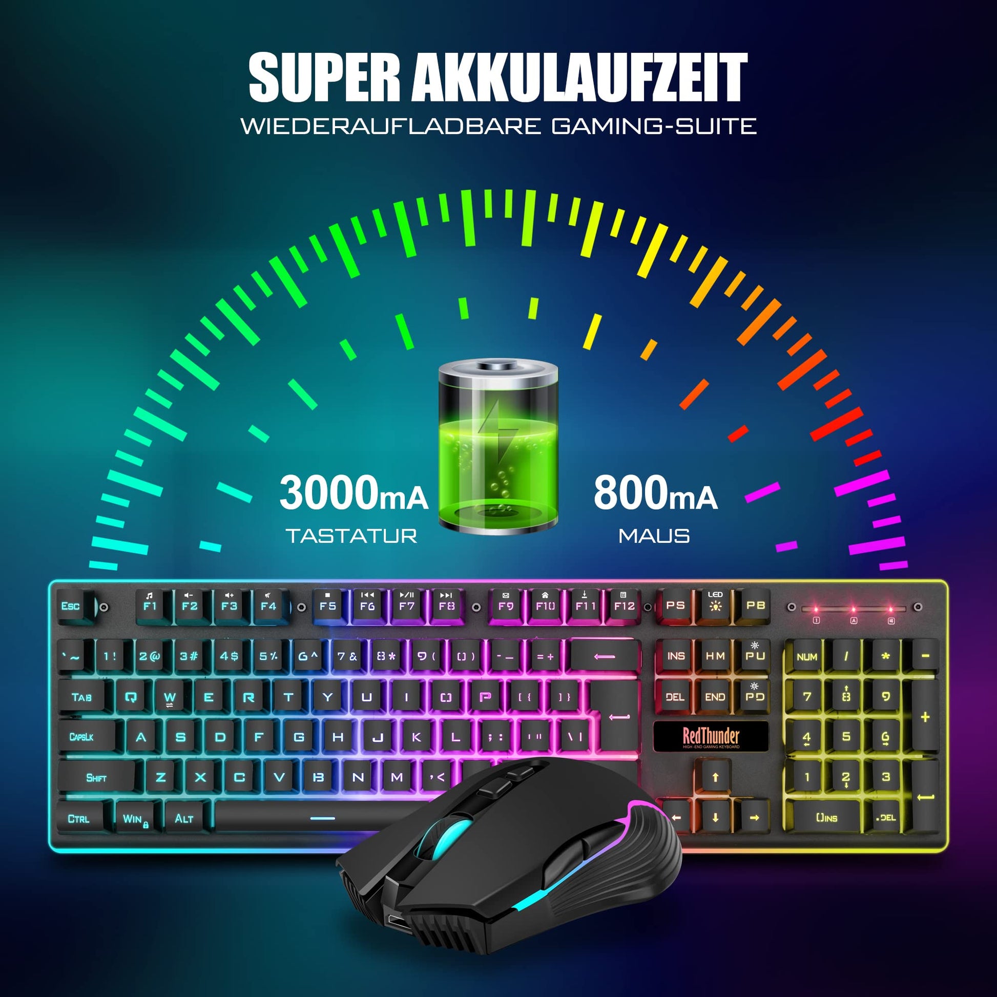 RedThunder K10 Wireless Gaming Keyboard and Mouse Set, QWERTZ DE Layout, 3000mA battery capacity and 3200 DPI for gamers (Black)
