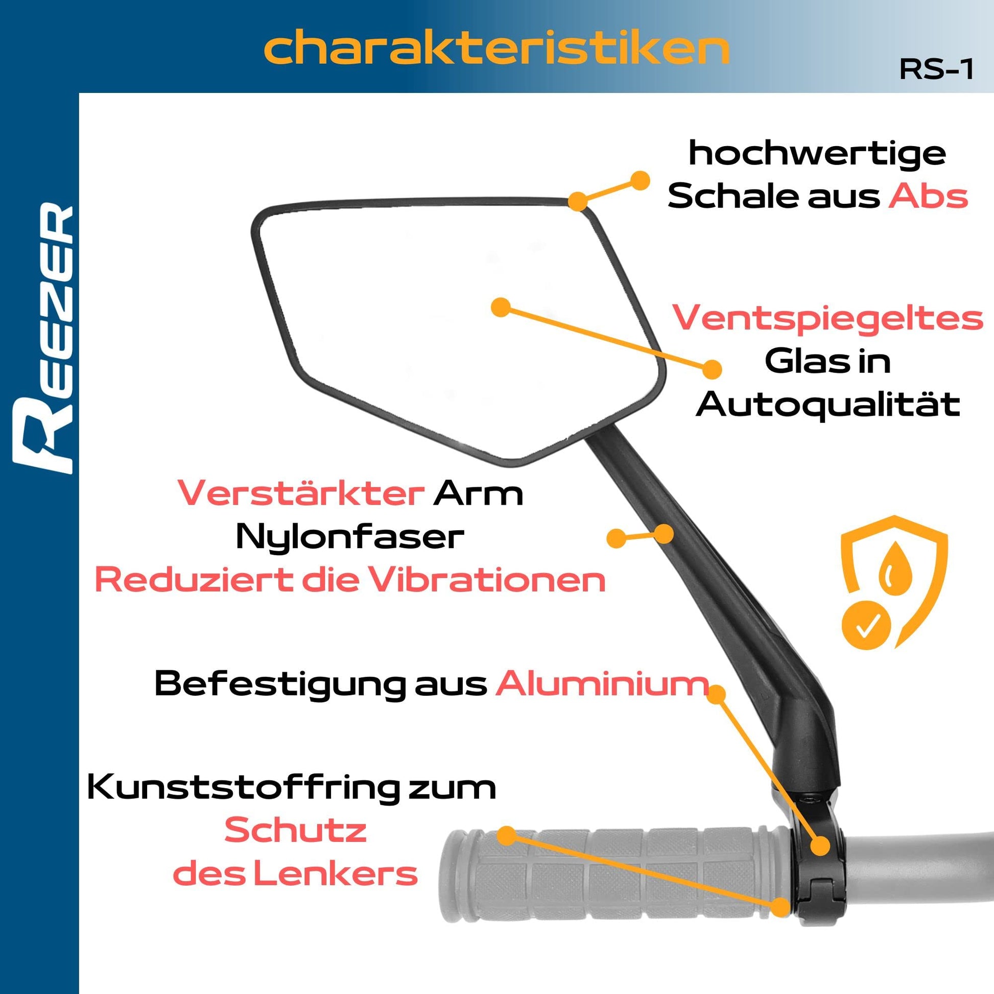 TREFFEN SIE DIE RICHTIGE WAHL: With almost all competitor products, safety is not the focus, but design. Therefore, we aimed to develop a bike mirror that prioritizes maximum visibility and safety on the road. With our REEZER rearview mirror, we have succeeded in combining safety, stability, and robustness. So, do not wait any longer and ensure your safety."