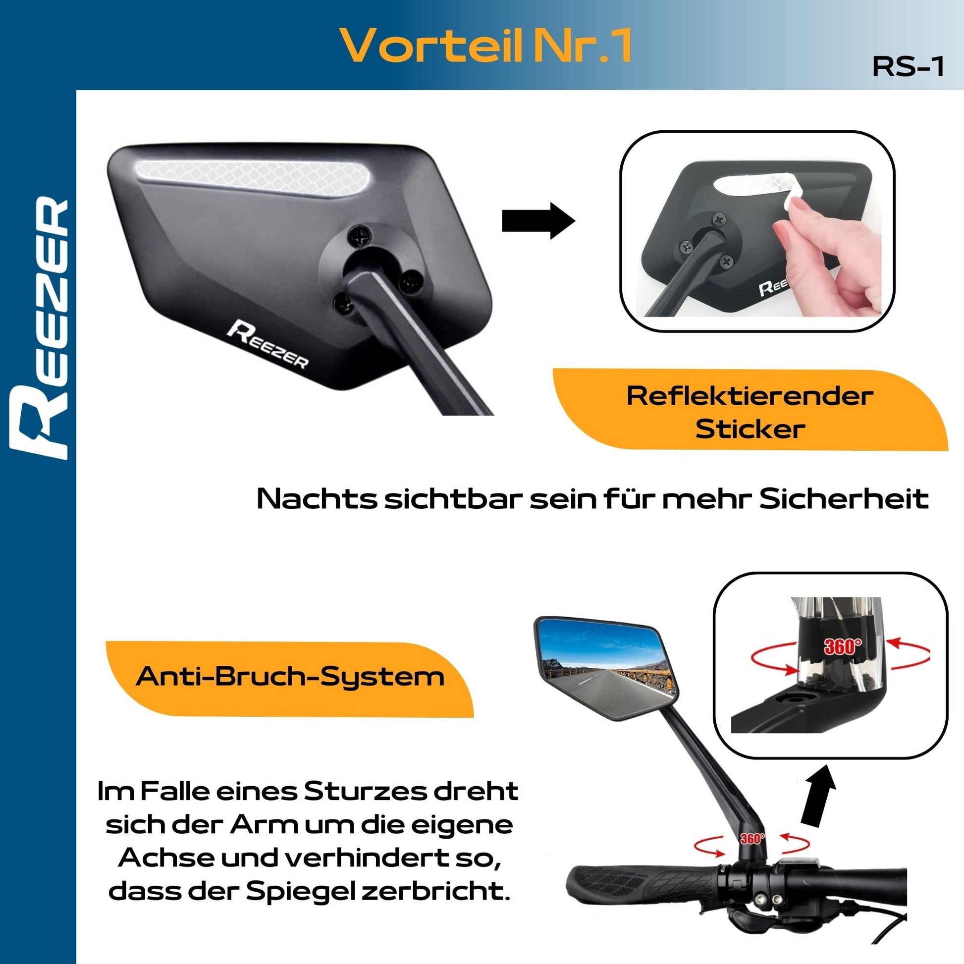 Make the Right Choice: With almost all competitor products, safety is not the main focus, but rather design. Therefore, we aimed to develop a bicycle mirror that focuses on maximum visibility and safety on the road. With our REEZER rearview mirror, we have successfully combined safety, stability, and robustness. So don't wait any longer and ensure your safety."