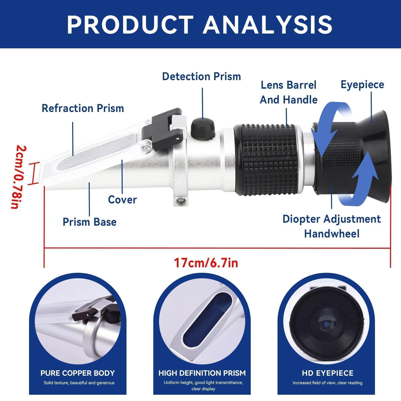 ["AUTOMATIC TEMPERATURE COMPENSATION - The brix refractometer has an automatic temperature compensation function. The temperature ranges from 50 to 86 degrees Fahrenheit, coolant refractometer to minimize the influence of temperature on test results","EASY TO USE - honey refractometer sugar test range 0-90%, The sugar content has a low refractive index, sugar meter without piercing light weight and brake fluid tester is packed in a plastic box, which is easy to store and transport and very convenient to use","ACCURATE AND PORTABLE - This sugar thermometer with a higher measurement of refraction than other ordinary refractometers, alcohol meter accuracy is 0.1%, sturdy design, light and easy to carry","ALUMINUM MATERIALS - The beer brewing kit is made of high-quality aluminum materials and is portable, does not require batteries, brake fluid exchanger unit is sturdy and durable and can be used for a long time","MULTIPURPOSE - The brake fluid tester is widely used in daily life and is mainly used for the simple and practical measurement of sugar content in fruits, honey, maple syrup, and other sugary drinks"]