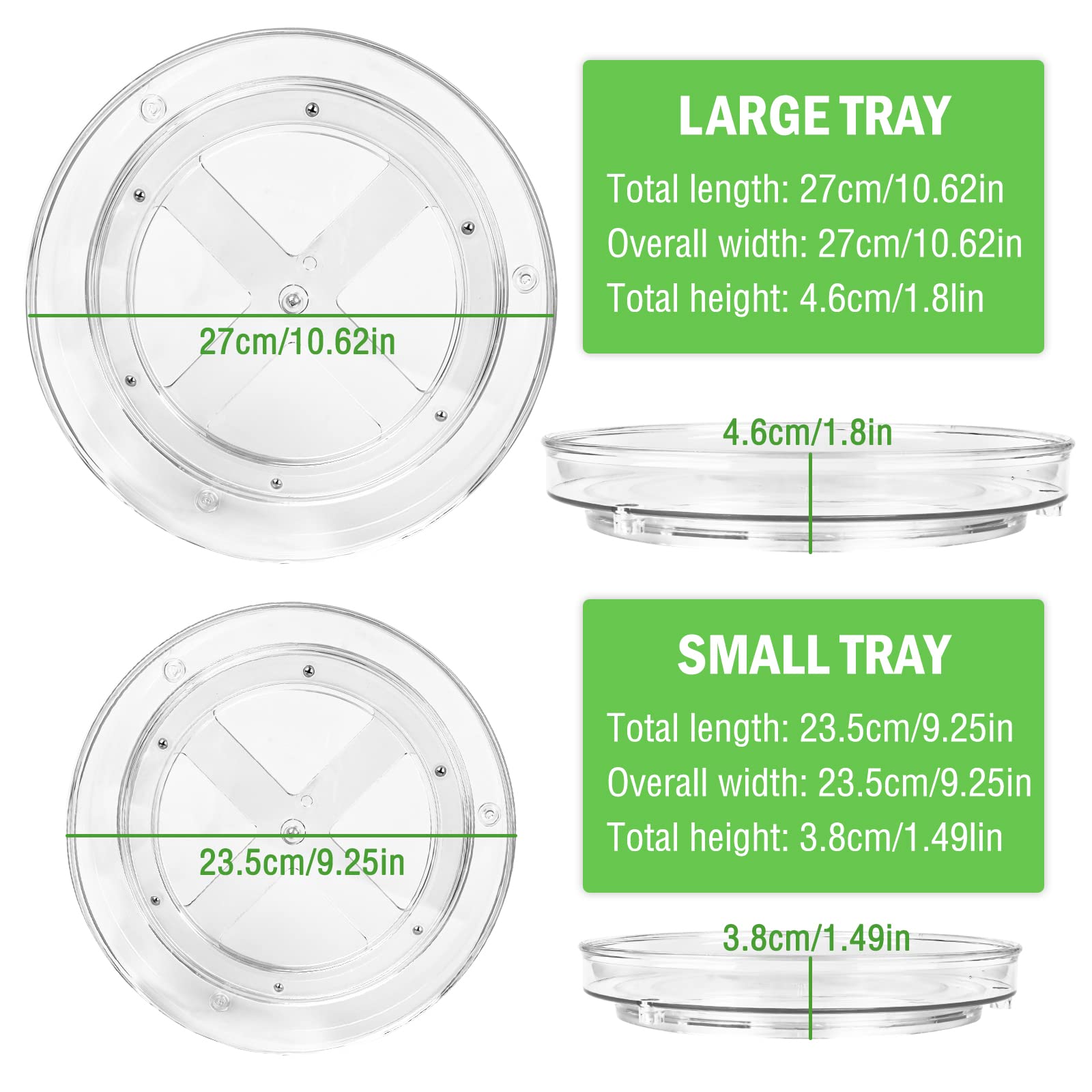 "✔️【TURNTABLE KITCHEN MADE OF EXCELLENT MATERIAL】You will receive 2 pieces of 360 degree rotating refrigerator turntable. The lazy susan turntable measures 27x4.6 cm and 23.5x3.8cm. The fridge rotating plate is made of PET, moisture-proof, mothproof, durable and stable plastic, can carry heavier jars.