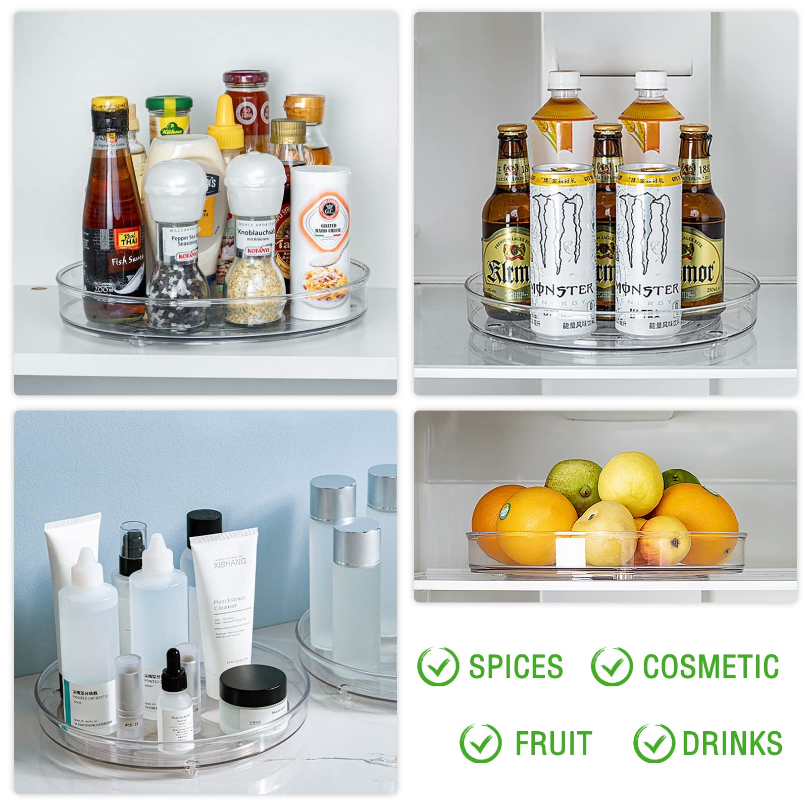 "✔️【MULTIFUNCTIONAL ORGANIZER】The rotating organizer is perfect for organizing your kitchen, refrigerator, craft room, pantry, or even your bathroom cabinets. The rotating spice rack can be used as a spice rack, medication organization, food storage, and for cosmetics, perfume, skincare products, figurines, and office supplies.