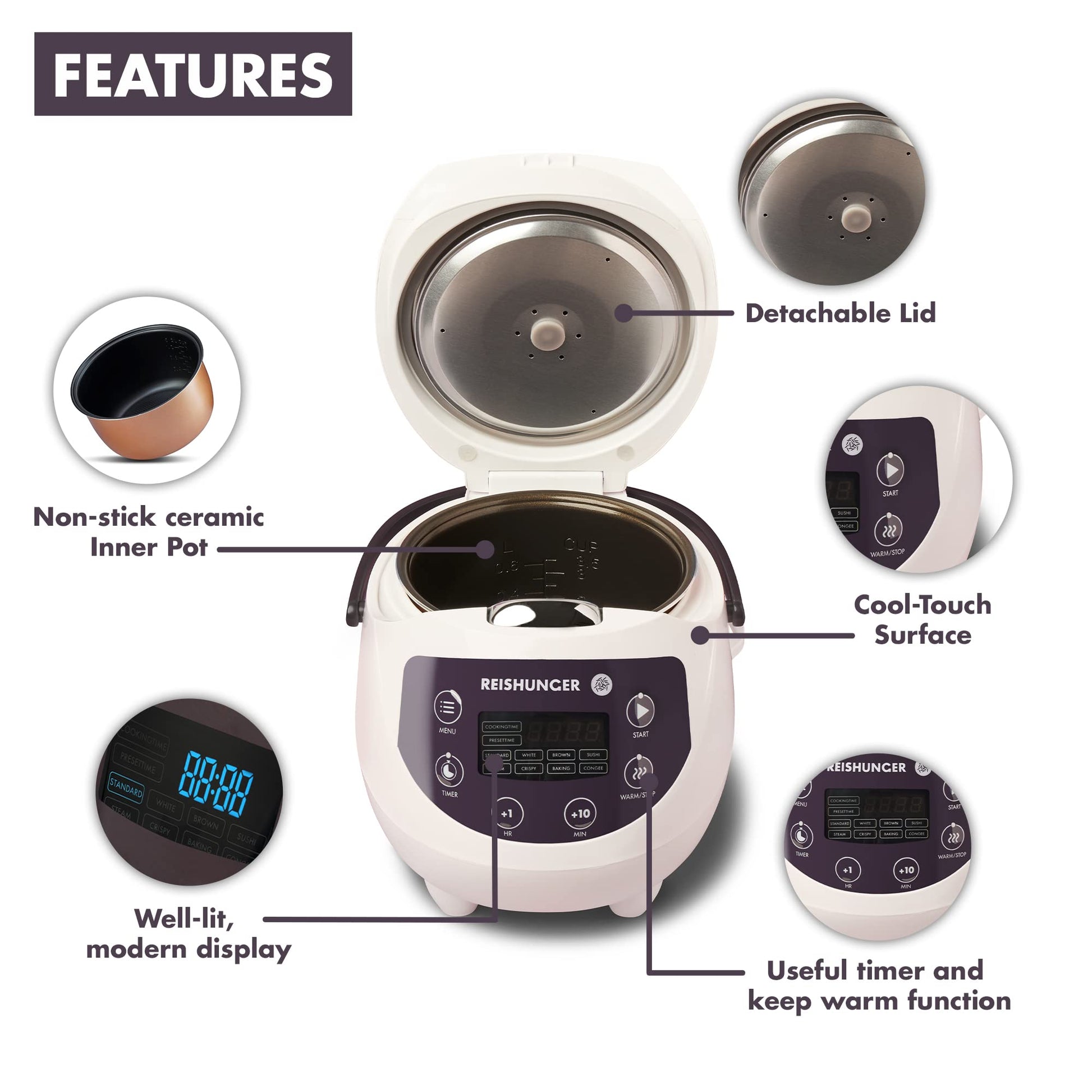 REISHUNGER Digital Rice Cooker Small, White | 0.6 L for 3 people | Keep Warm Function, Timer & Premium Pot | Small Multi-Cooker & Steamer, 8 Programs, 7-Phase Technology