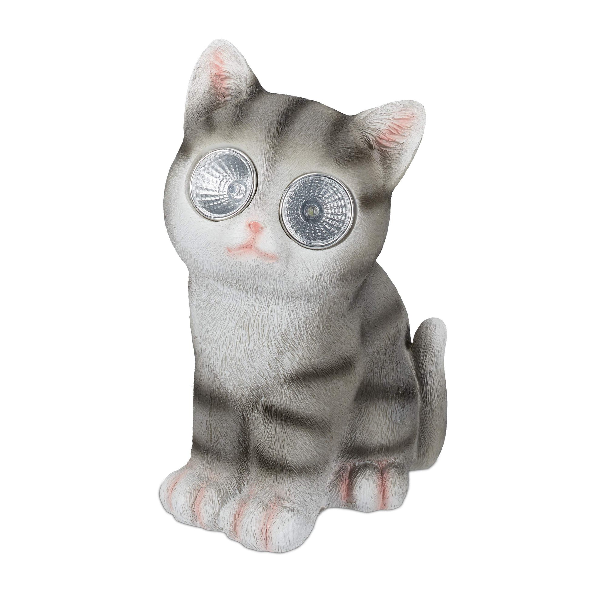 Relaxdays 4 x Garden Figurine Cat, Figure with LED Solar Eyes, Resin, Decoration for Garden, Balcony, HxWxD 23 x 12 x 14 cm, Grey