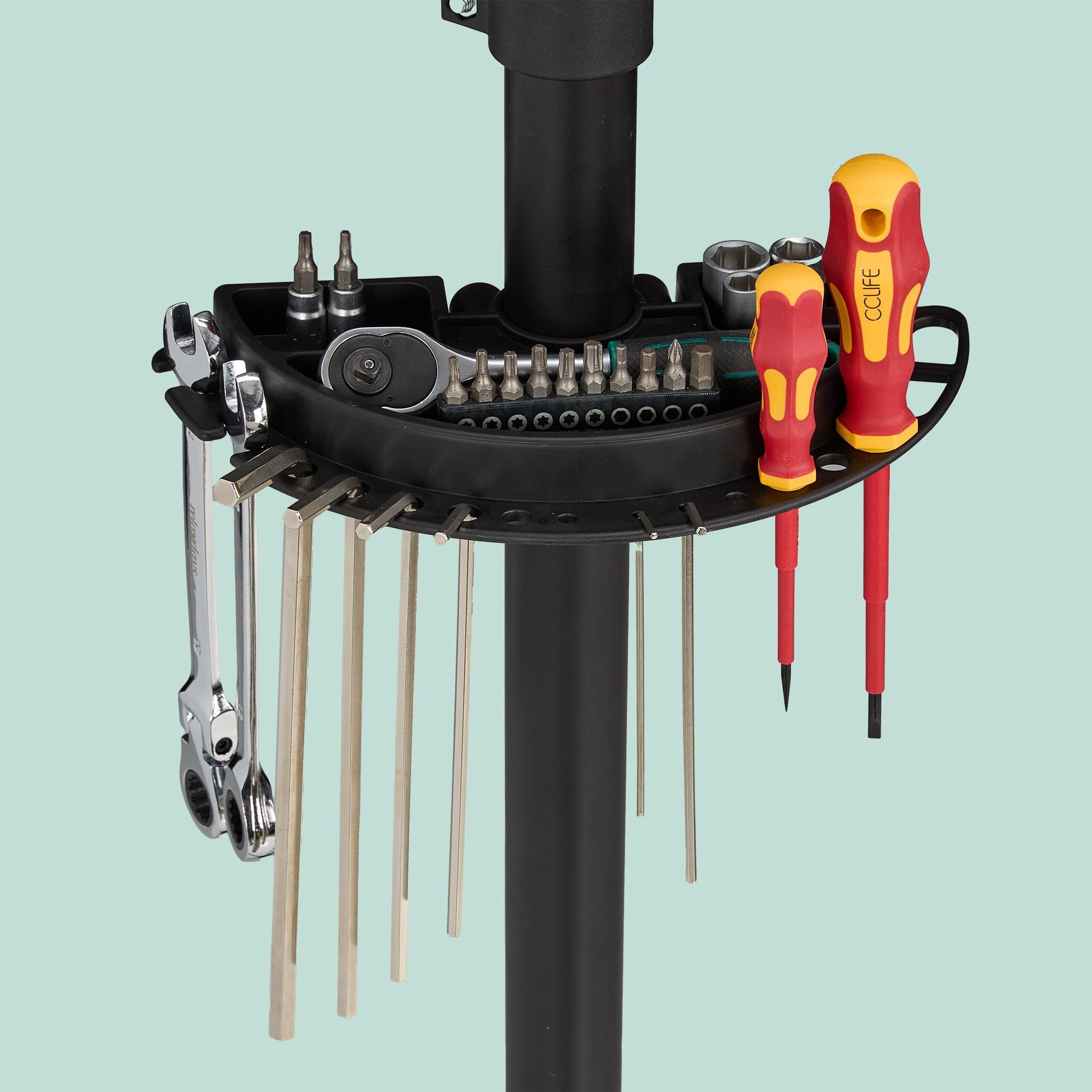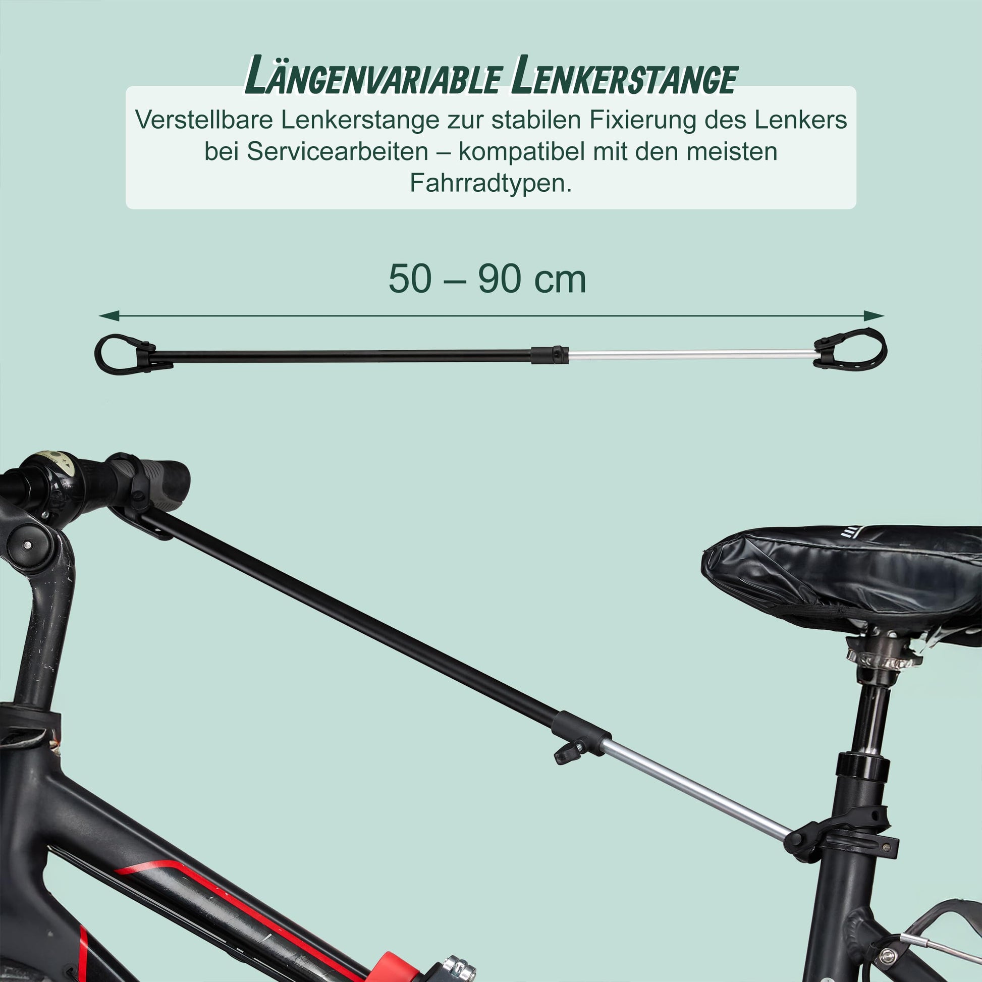 ["Assembly stand for hobbyists & minor repairs - Work without tiring bending","Adjustable height from approx. 110-190 cm | 360° tilt of the clamping arm","Bike repair stand with magnetic tool tray & handlebar fixation","Screw without damaging paint: Padded clamping arm with quick release","Stable tripod base | up to 66 lbs load capacity | for bike frames Ø 2.5 to 4 cm"]