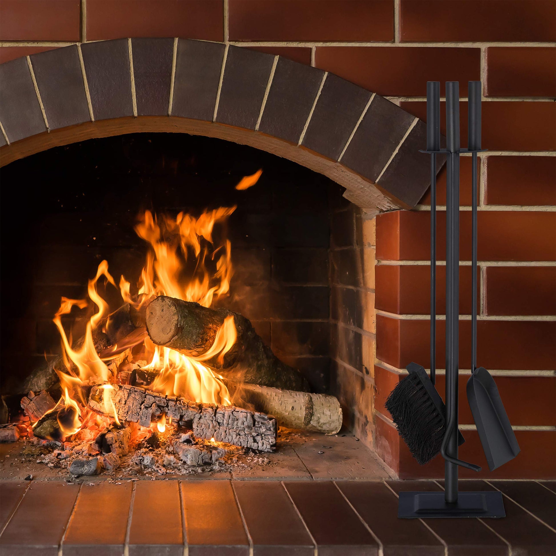["Fireplace tool set: 4-piece set including ash brush, fireplace shovel, poker, and stand for hanging", "Flickering fireplace: hook for kindling the fire - broom and shovel for cleaning the fireplace", "Space-saving: sturdy steel fireplace set keeps stove accessories handy and organized", "Modern: Black fireplace accessories in a sleek design - becomes a decorative focal point in the living room", "Details: Length poker approx. 21 inches - Length ash shovel approx. 22 inches - Length fireplace brush approx. 22 inches"]