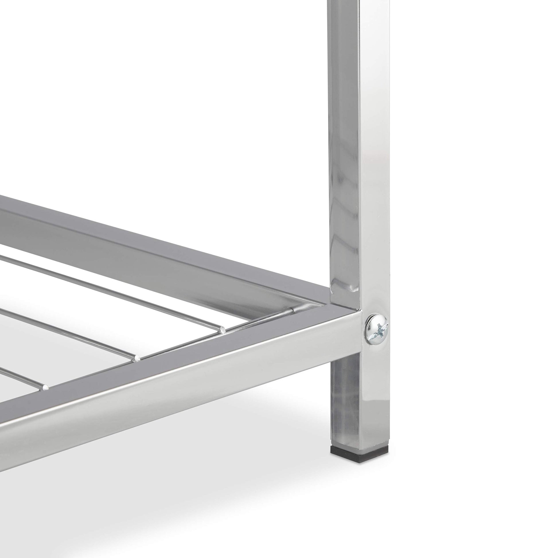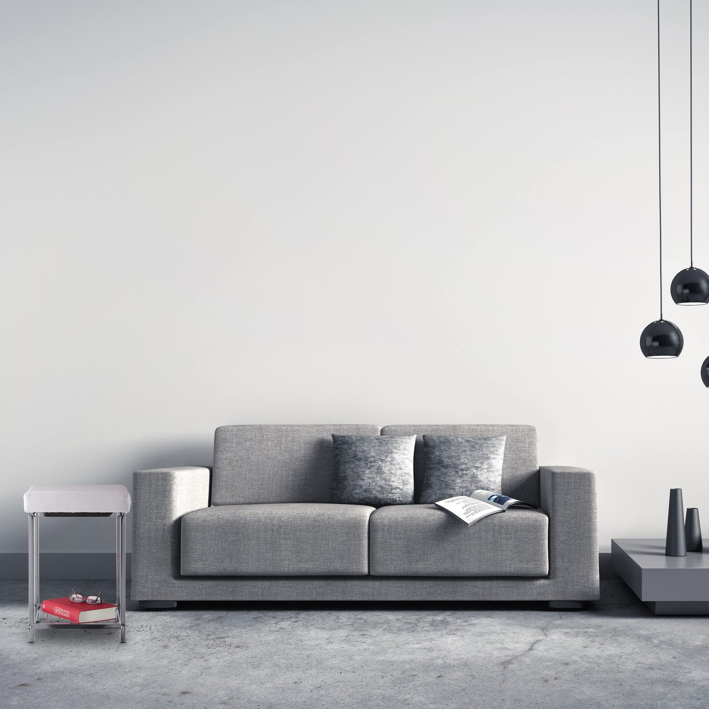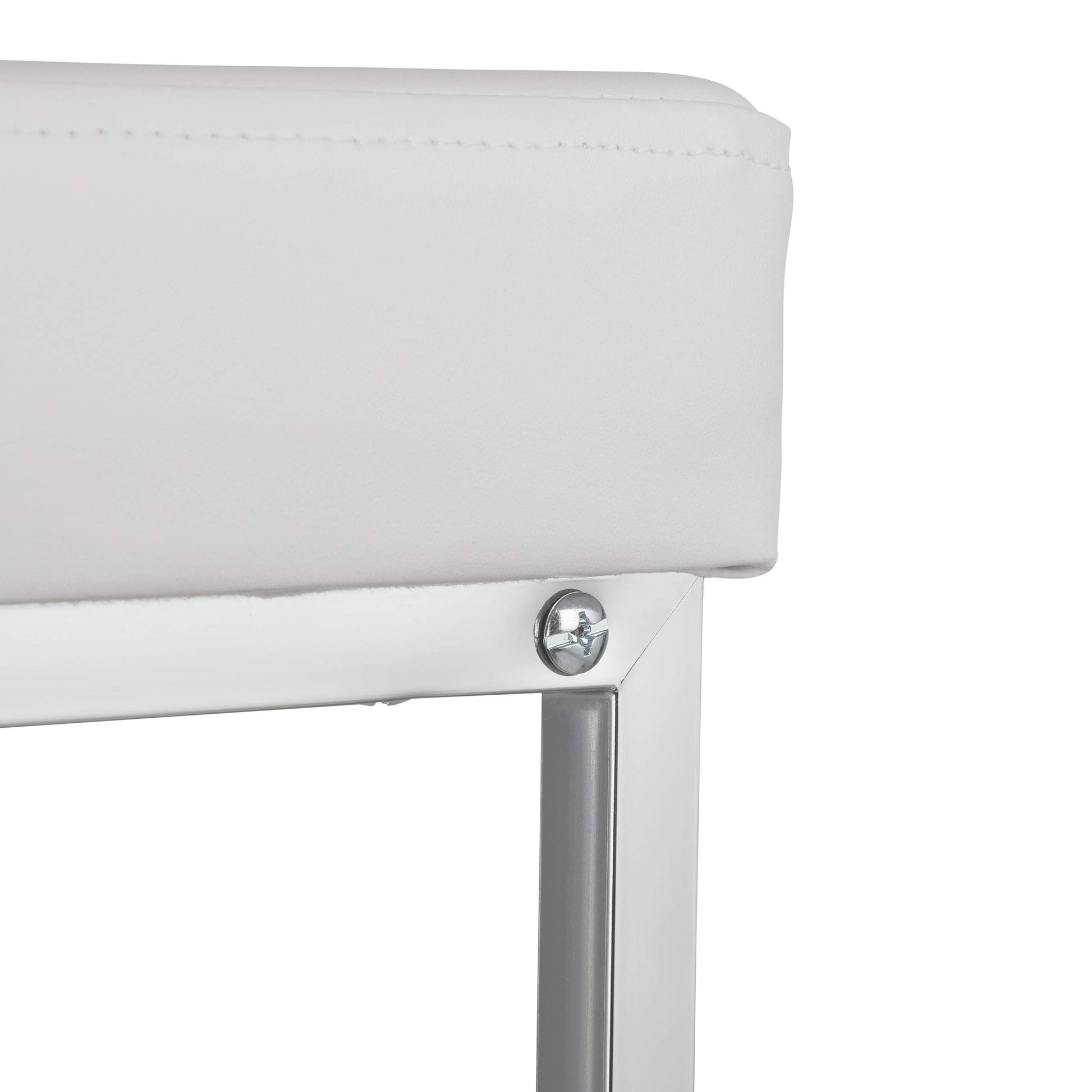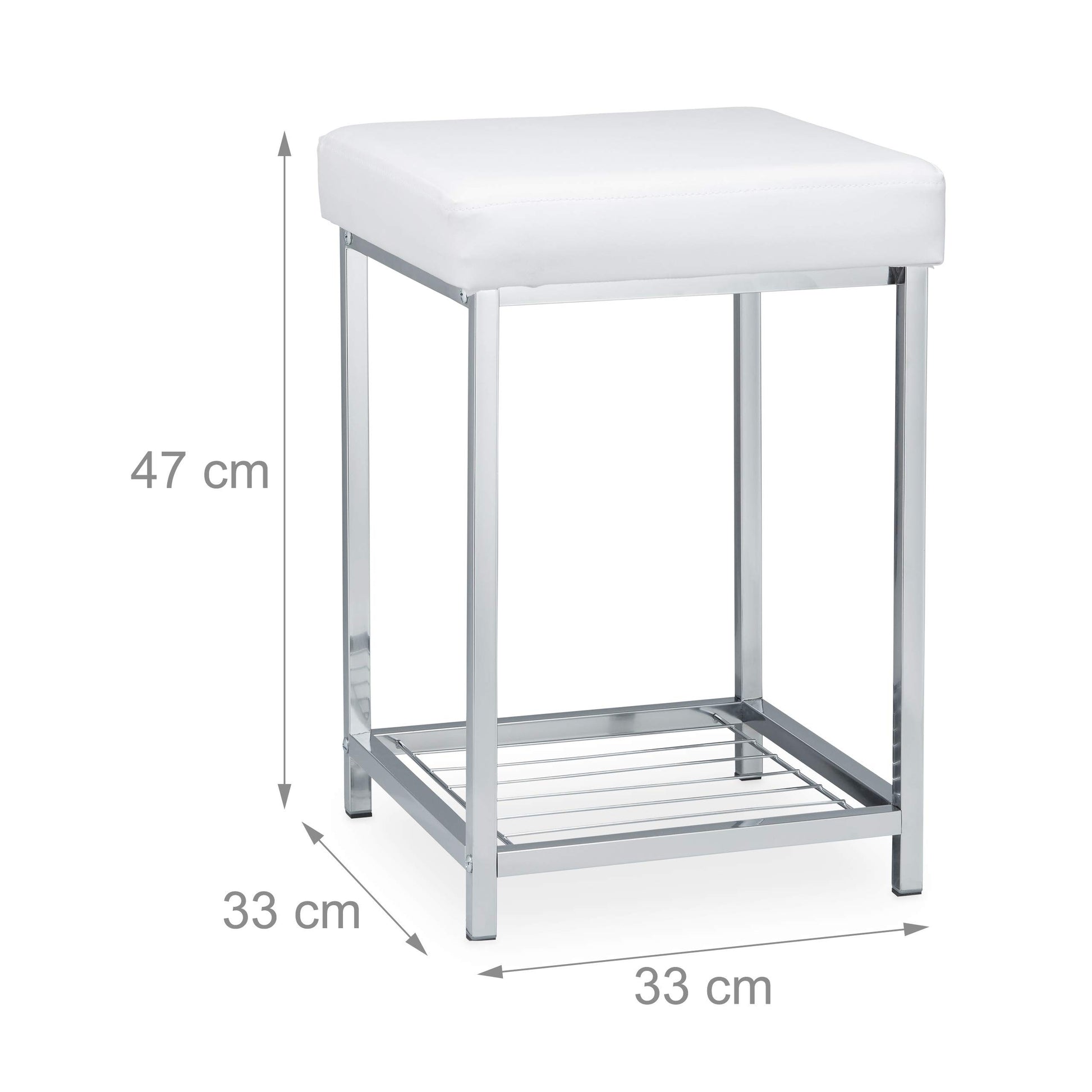 ["Seat: Square stool in space-saving design - H x W approx. 47 x 33 cm - Fits in any corner","With practical storage space: Stool with level for storing magazines, magazines, etc.","Elegant design: Upholstered stool with shiny chrome-plated iron frame and white seat","Comfortable: Small stool with padded seat with faux leather cover for comfortable sitting","Versatile: As a seating option at the dressing table, in the hallway and living room, as a bathroom stool or footrest"]
