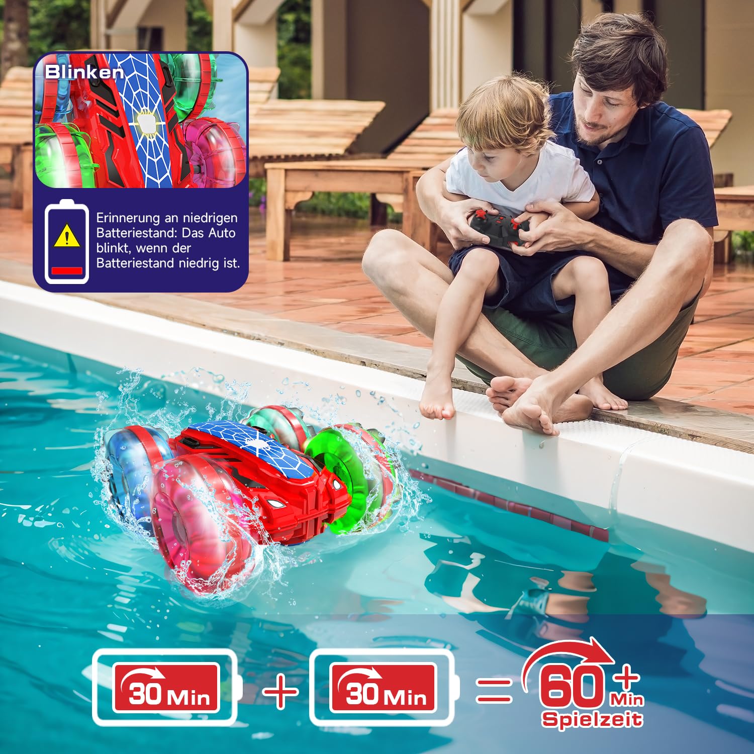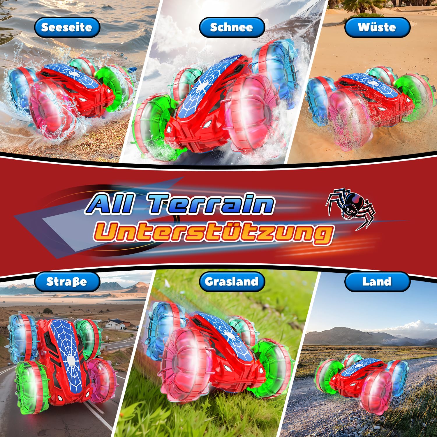 ["Remote Control Amphibious Vehicle Car for Ages 6 and up: Thanks to its precise sealing, the RC car is waterproof and runs smoothly on both land and water, in snow, mountains, and other locations. In water, it effortlessly transforms from an off-road RC car into a remote-controlled boat, making it a perfect pool and outdoor water toy for kids! It encourages children to actively participate in outdoor leisure activities and allows them to play without restrictions.","Remote Control Car with Hand Steering: The amphibious vehicle has two remote control modes, remote control and hand steering mode, making it more convenient and interesting. (The remote control is not waterproof, please keep it away from water). Powered by a powerful 2.4 GHz interference-free frequency, the RC car is easy to perform 180°, 360° rotation stunts and double-sided driving functions with a twist of the wrist, providing a more fun driving experience for children.","Cool Glowing Wheels: Ignite your adventures with dazzling LED wheels! With its unique spider shape and built-in colorful LED wheel lights, this remote-controlled car boat attracts the attention of a boy during the day and night! The colorful lights shine through the transparent wheels, making the amphibious remote-controlled vehicle even cooler pool toy for kids.","Provides about 1 hour of driving pleasure: Uninterrupted fun is guaranteed! Equipped with two 1200mAh high-capacity rechargeable lithium batteries, you can enjoy 1 hour of driving fun without waiting. Not only that, the remote-controlled boat also comes with a low battery warning, if the RC car's red light flashes, it means it should be charged immediately. For a better experience on the water, it is recommended to check if the screws in the battery compartment are securely tightened before playing.","Cool Gift for 6 7 8 9 10 Year Old Boys: The amphibious vehicle is made of high-quality ABS plastic. Its sturdy construction withstands play and is suitable for indoors, outdoors, sunny and rainy days, and easily handles all kinds of terrain. It comes with a German-language instruction manual and tutorial video so that children can easily get started. The RC car is delivered in a beautiful gift box and is a gift idea for 6+ year old boys and girls."]