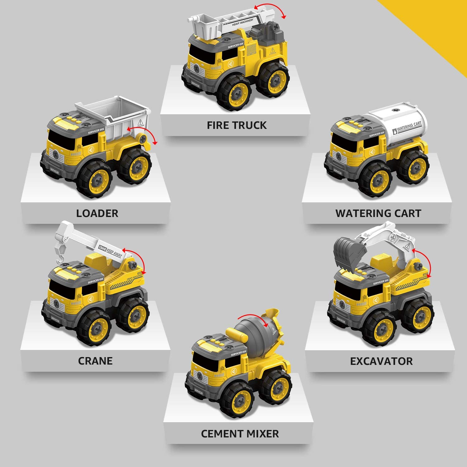 ["【Innovative DIY Construction Vehicle Set】Includes 6 vehicles like excavator, loader, sprinkler, crane, excavator, and cement mixer with exciting light and sound effects, ideal for playful learning for children ages 3 years and up.", "【Multifunctional Remote Control】The included electric screwdriver is not only used for disassembling the vehicles but also serves as a remote control for dynamic play - up to 40 meters range.", "【Promotes Developmental Skills】This toy helps children improve hand-eye coordination and fine motor skills while engaging in creative play with friends, family, or on their own.", "【Safe and Durable】Made from high-quality ABS plastic with smooth edges, perfect for small hands. The included electric drill operates at low speed and voltage to ensure maximum safety.", "【The Ideal Gift】Perfect for birthdays, Christmas, and other holidays. This construction vehicle set is specially designed for boys and girls ages 3 to 6, promoting playful learning."]