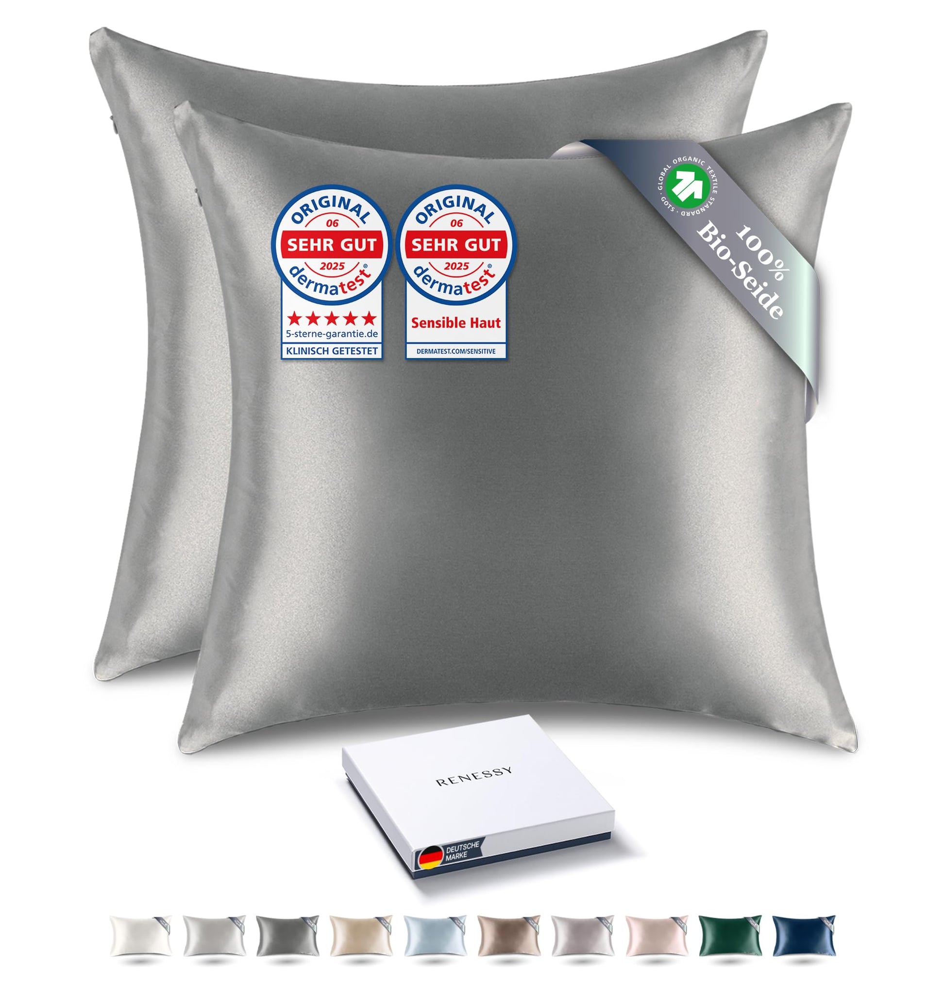 REAL 22 MOMME SILK | Did you know that many silk products claiming to be 22 momme do not meet this standard? RENESSY pillowcases are lab-tested to ensure they meet the real 22 momme standard - for the quality and durability you deserve.","π‘οΈ CERTIFIED SAFETY | OEKO-TEX certified in Germany, guaranteeing free from harmful chemicals. Safe for everyone, including babies and those with sensitive skin, so you can rest assured with each use.","π‘οΈ COMFORT FOR ALL SEASONS | Whether warm summer nights or cold winter evenings - silk naturally adjusts to keep you cool or warm, helping you wake up refreshed and sweat-free.","π PERFECT GIFT | Packaged in an elegant gift box, our pillowcase is the ideal gift for birthdays, weddings, or any special moment where you want to bring joy to someone.","π EASY CARE | RENESSY silk maintains its softness and vibrant color over time. Simply wash at 30Β°C with a pH-neutral detergent; dries quickly and remains virtually wrinkle-free - no ironing required.","π CHOOSE THE RIGHT SIZE | Use our size chart for the correct selection, especially for neck pillows or memory foam pillows."]