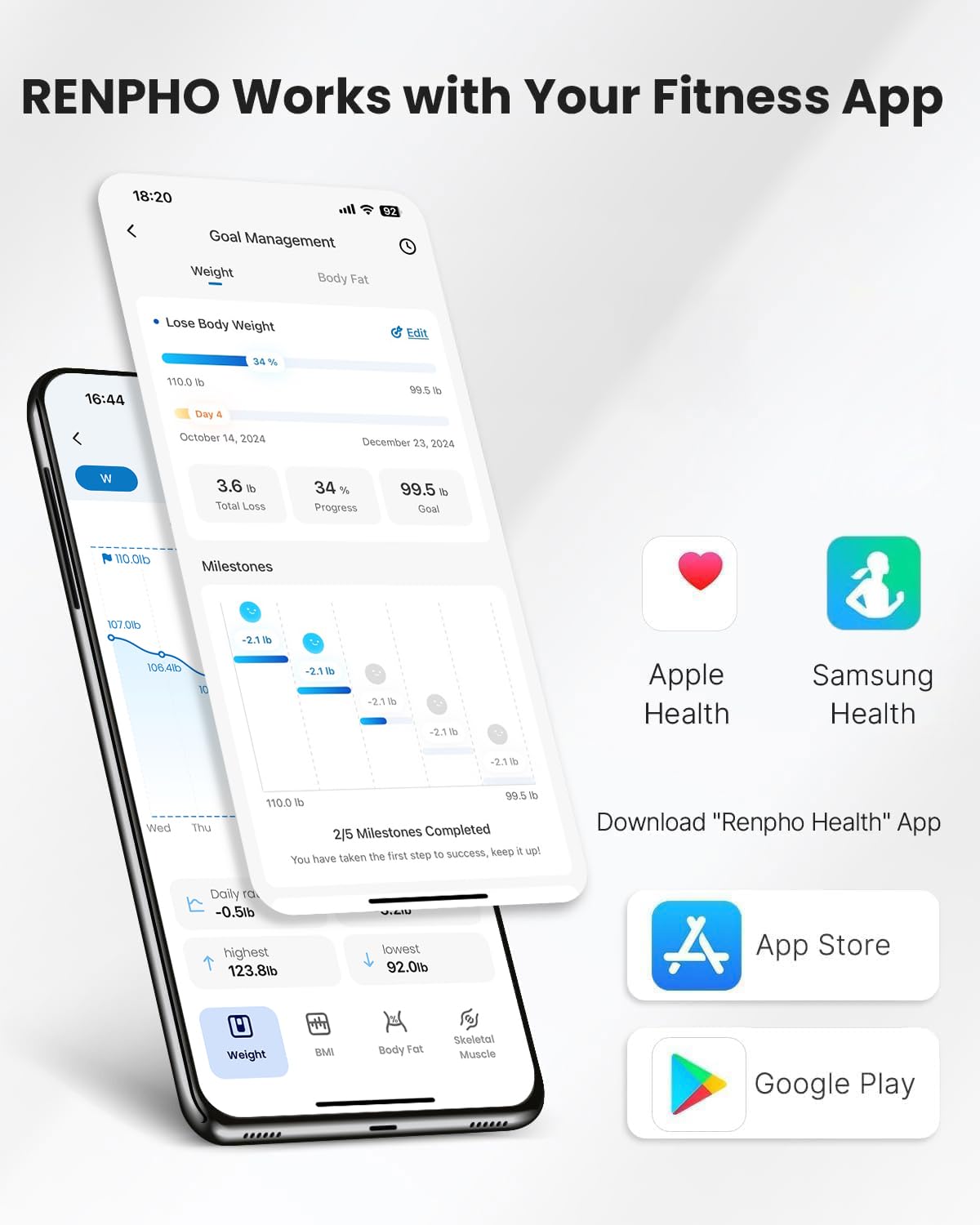 Compatible with fitness apps: The Renpho Health App easily syncs with Apple Health, Samsung Health, Fitbit, and Apple Watch, allowing you to easily store and share your data. You can download the Renpho Health App on the App Store or Google Play.