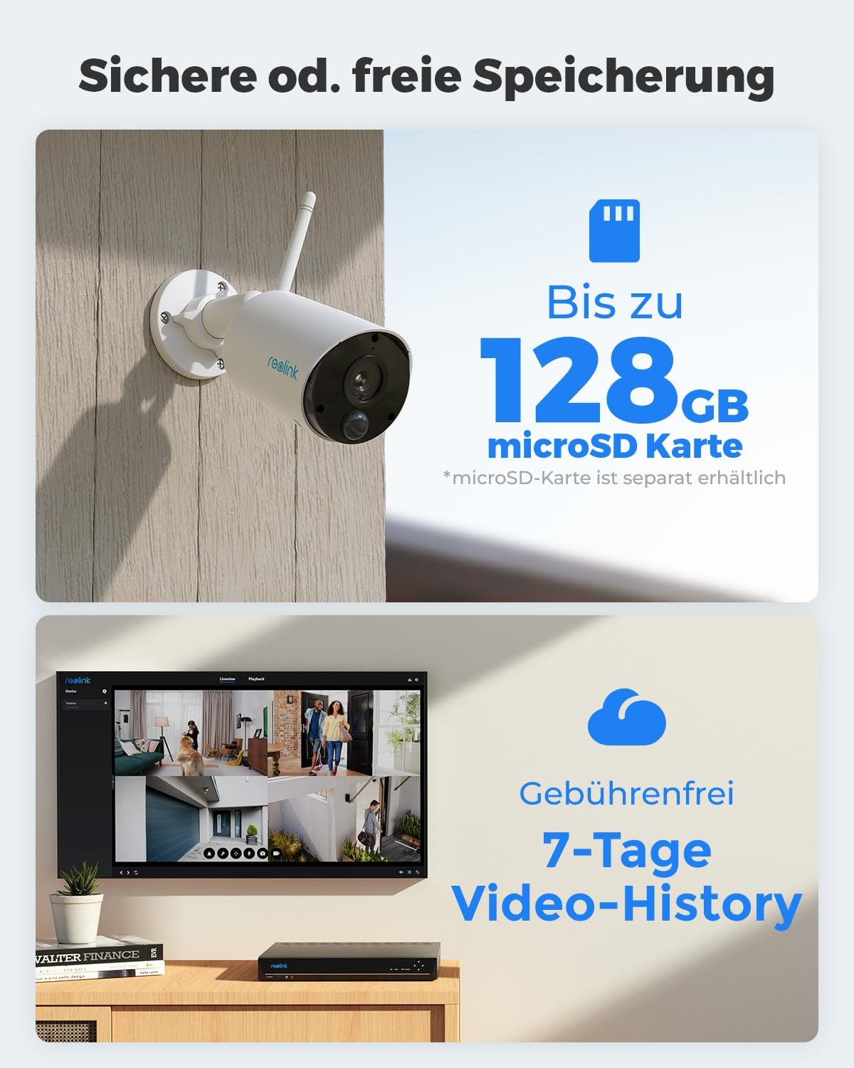 "Flexible Storage and Playback: Save event videos on the microSD card (not included) or in the encrypted Reolink Cloud (optional). After intelligent filtering by the Reolink app/client, you can quickly find desired videos without a subscription.",