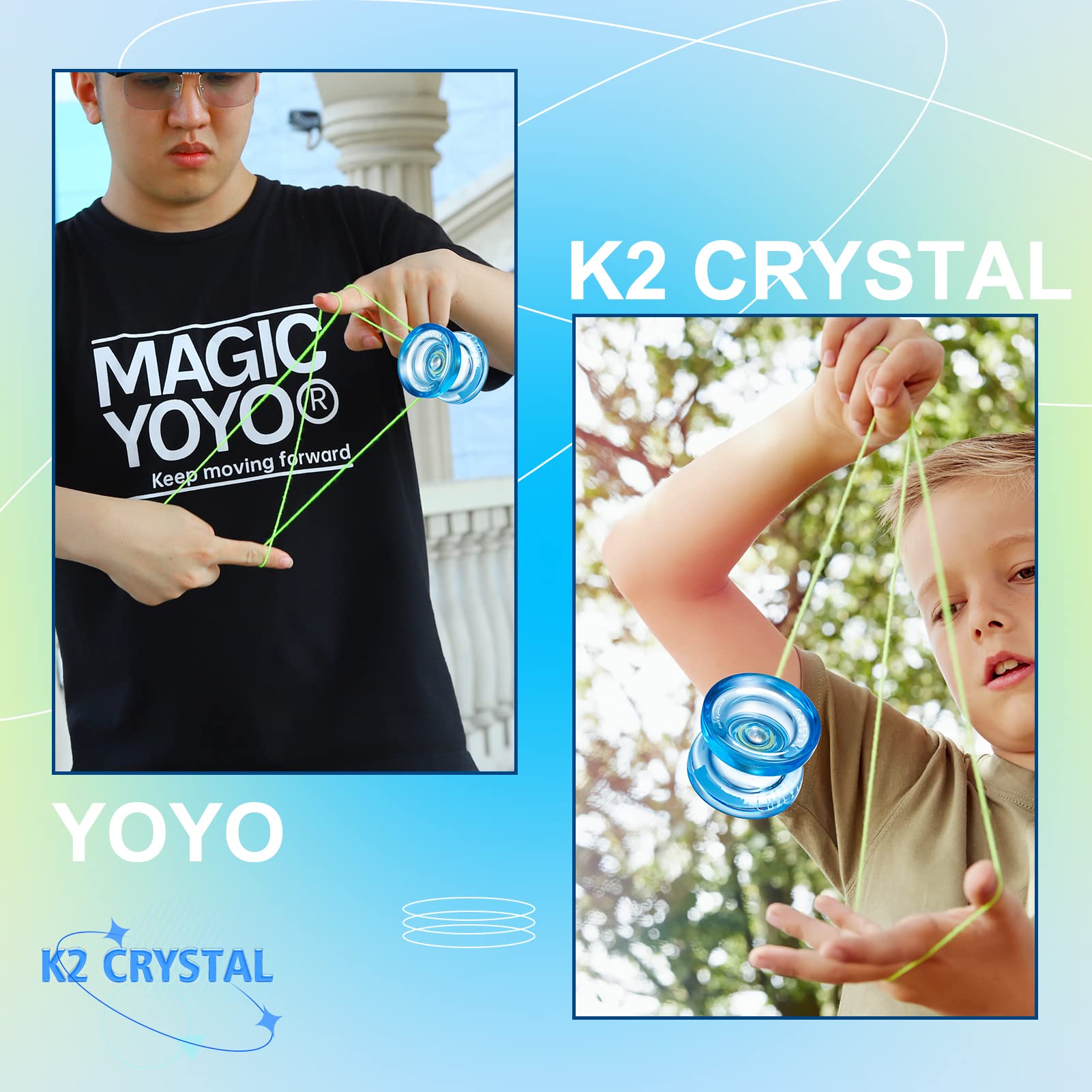["RESPONSIVE YOYO FOR KIDS BEGINNERS: YOSTAR responsive yoyo K2 Crystal Blue is a plastic beginner level yoyo for kids. It comes in responsive mode (narrow bearing), excellent for beginners to practice basic string tricks like: 1A 3A 5A, just a gentle pull on the string, it will easily return to your hand.","DUAL PURPOSE TRICK YOYO: The professional Yoyo K2 is a nice beginner yoyo that is both responsive and unresponsive. It converts from responsive to unresponsive by swapping the short axle and slim bearing for the longer axle and unresponsive bearing. After swapping, you get a new unresponsive Yo-Yo for adults, capable of performing many string tricks like 1A, 3A, 5A.","PREMIUM QUALITY PLASTIC YOYO: K2 Plastic Yoyo Professional is made of high-quality PC. The polycarbonate plastic is extremely durable and essentially shatterproof. Polycarbonate is known for its durability. This yo-yo has a pleasant feel and weight and spins longer than most responsive Butterfly-style yo-yos.","PACKAGE INCLUDE: 1 x Responsive Yoyo K2 Plus Crystal Blue, Bonus: 5 x Yoyo Strings (random color), 1 x Yo-Yo Bag, 1 x professional bearing removal tool, 1 x unresponsive bearing for exchange, 1 x M4 * 10 mm axle for unresponsive bearing, all included what you need to get started! It comes in responsive mode (narrow bearing) and would work well with the included wider concave bearing when unresponsive.","IMPORTANT: 1. For responsive yoyo, if the yoyo does not come back sensitively, it is recommended to add a little lubricant or stainless oil to the bearing (add oil inside and outside of the bearing). 2. After switching to Unresponsive yoyo, it will not come back to your hand when pulled up. You need to learn a trick called binding to bring the yoyo back."]