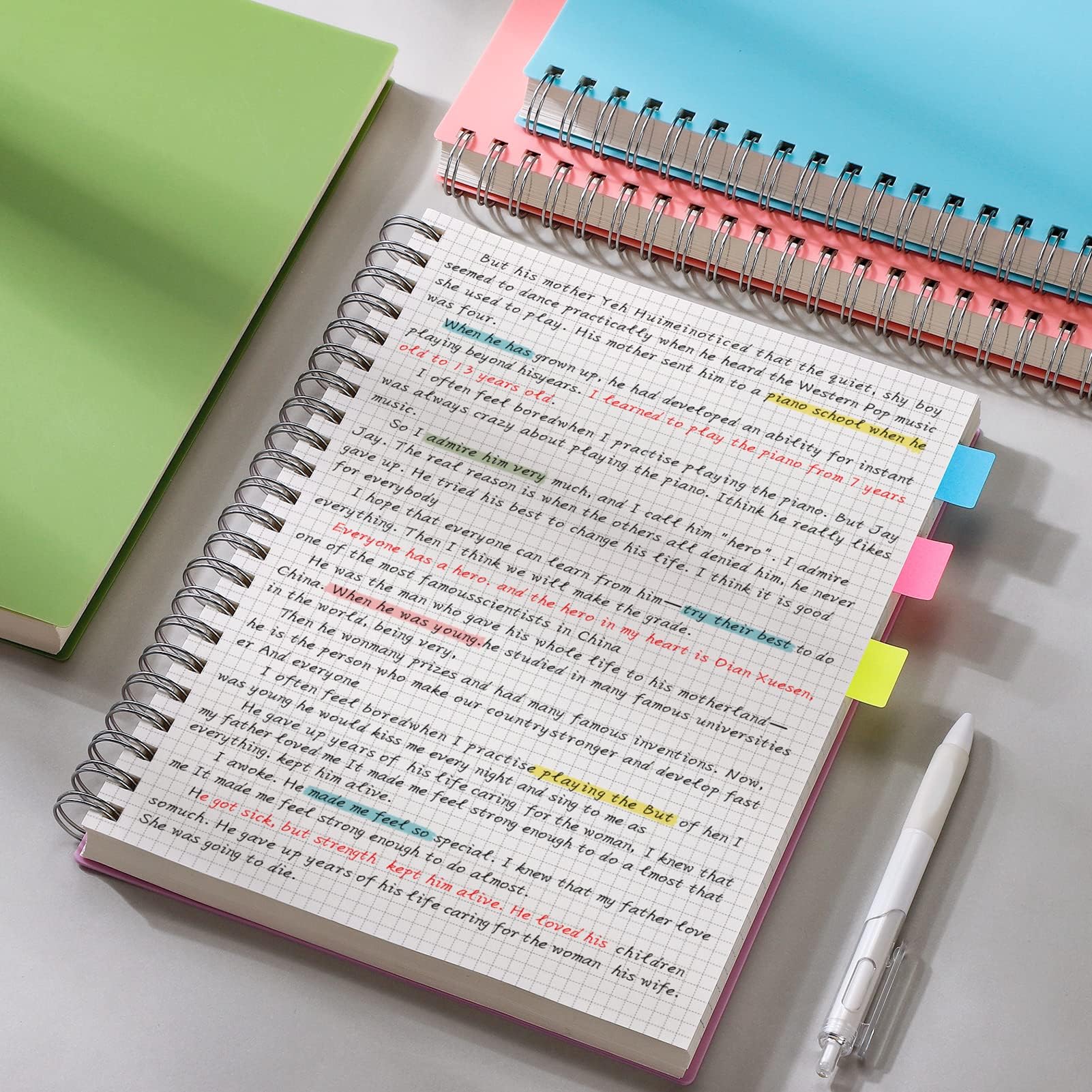 ["[1 A4 Notizbuch kariert] – The college-ruled notebook in A4 format (8.5 x 11 inches) comes with 150 sheets/300 pages of high-quality paper, equivalent to 4 A5 notebooks with 150 pages each.","[Colorful PVC plastic cover] – The cover is made of waterproof and foldable PVC material, which can be easily wiped clean even if accidentally exposed to colors, effectively protecting the notebook pages from wear and tear.","[High-quality paper] – The A4 ruled notebook paper quality is 100 gsm, providing a smooth and luxurious feel. It feels smooth, thick enough to prevent ink from bleeding through, and ensures a pleasant writing experience.","[Sturdy spiral binding] – The spiral binding is very durable and provides enough room for a pen. The spiral binding design allows for easy flipping and tearing of pages, with the additional benefit of being able to fold for a more comfortable writing position.","[Multipurpose] – Spiral notebooks are perfect for writing, drawing, taking notes, travel journals, study notes, and more. High-quality spiral notebooks make excellent gifts for family, friends, and business colleagues."]