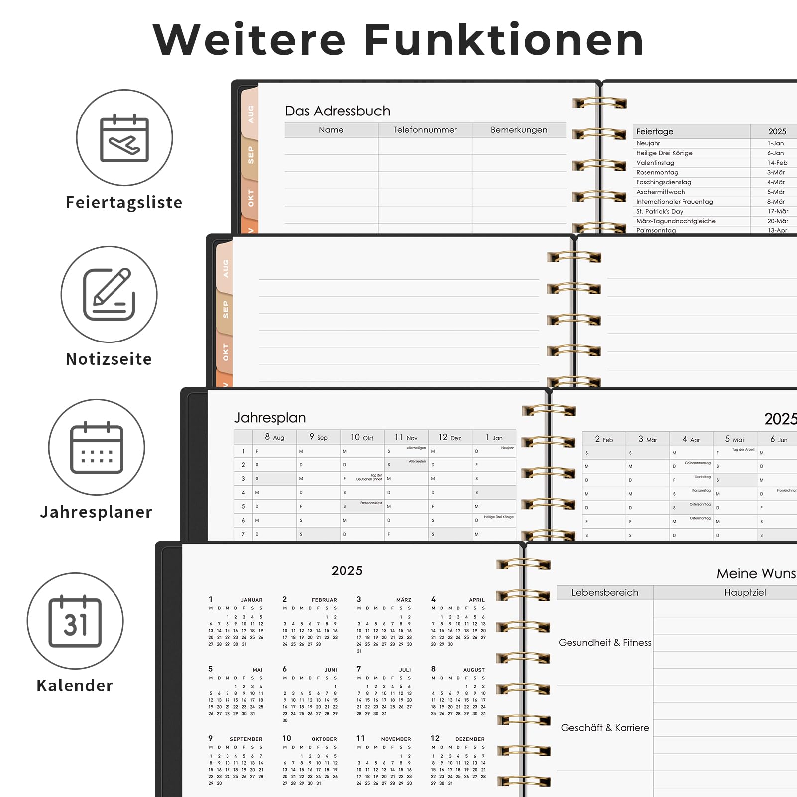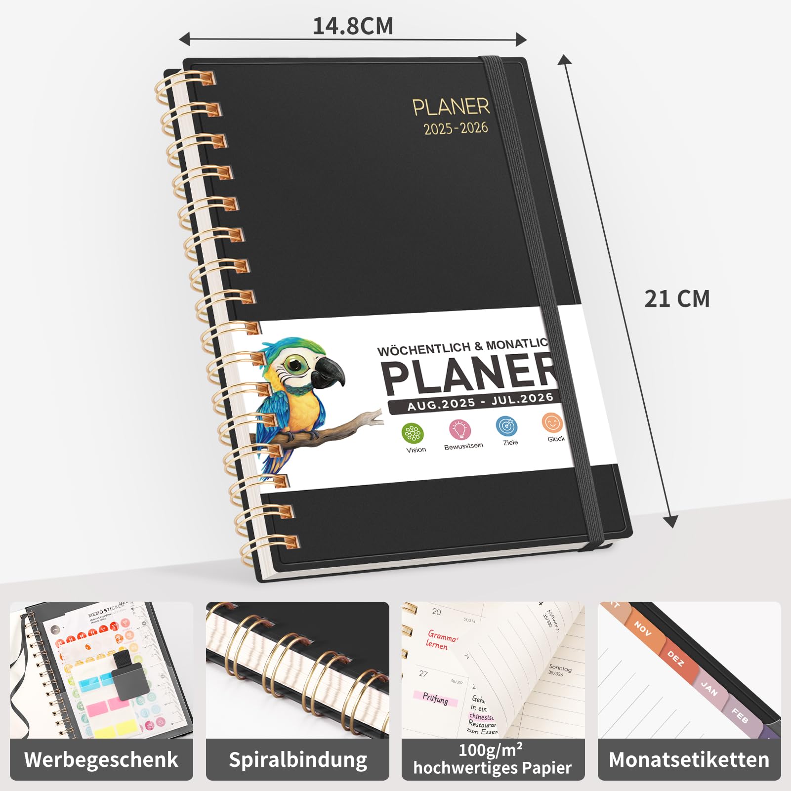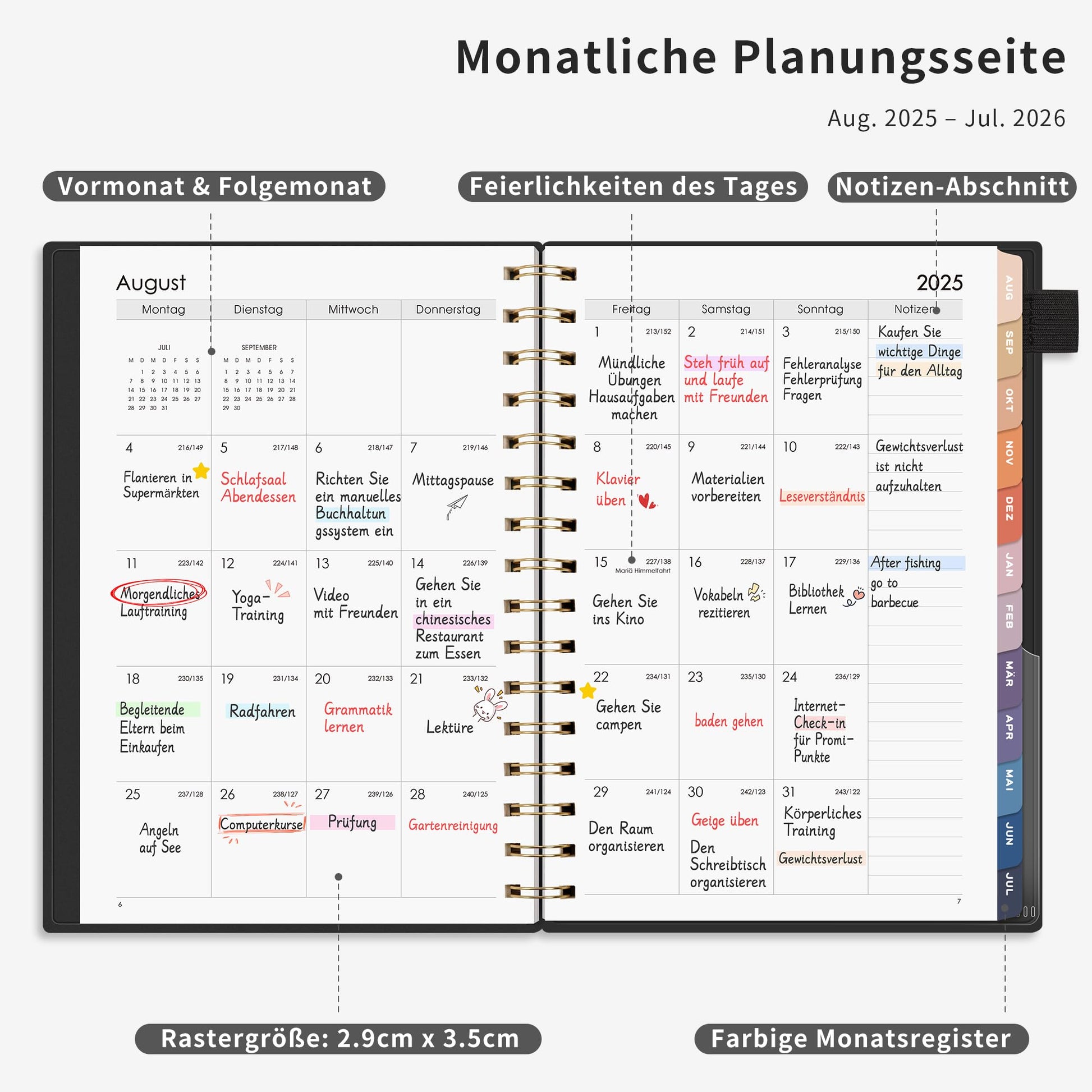["Creative School Planner 2025-2026: Helps achieve goals for work, travel & school. Ideal as a teacher's planner or back-to-school gift with plenty of space for ideas - get creative with your year.", "Manage monthly goals & daily tasks: Combined monthly calendar, weekly plan, and to-do lists for strategic planning from August 2025 to July 2026. Perfect as a school planner or family calendar.", "Appointment planner 2025-2026 with colored monthly tabs: Quick access to each month. Integrated weekly plan, to-do lists, and progress tracking - master tasks efficiently for study & daily life.", "Teacher's planner for balance: Unites study planning, career, savings goals, nutrition, and fitness in one notebook. Organize study, work, and personal life effortlessly - ideal for ambitions.", "Practical accessories: Elastic pen holder, ruler bookmark, PVC pocket for cards/receipts, ribbon bookmark, and 3-color sticky notes. Everything securely stored - perfect for on the go in the appointment planner."]