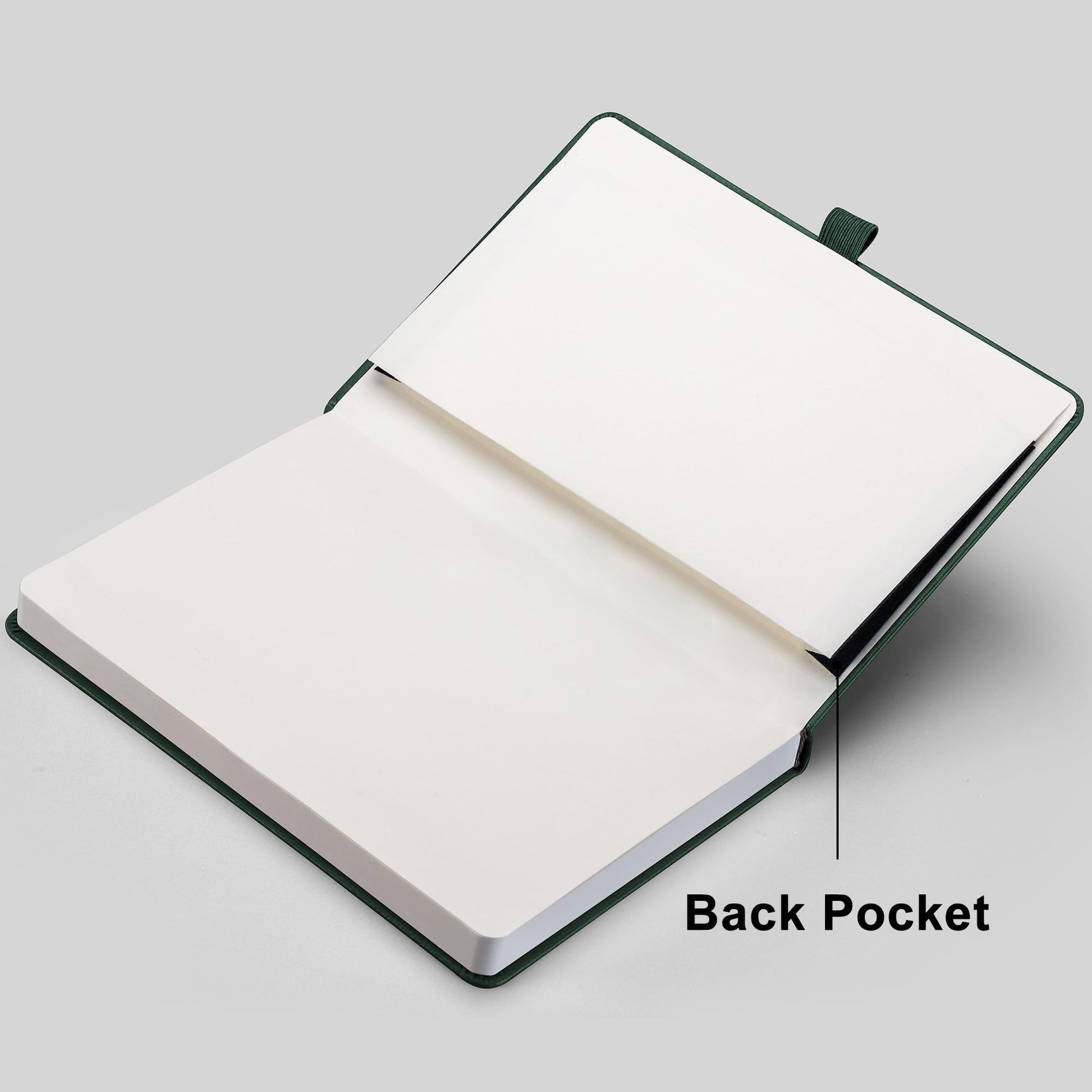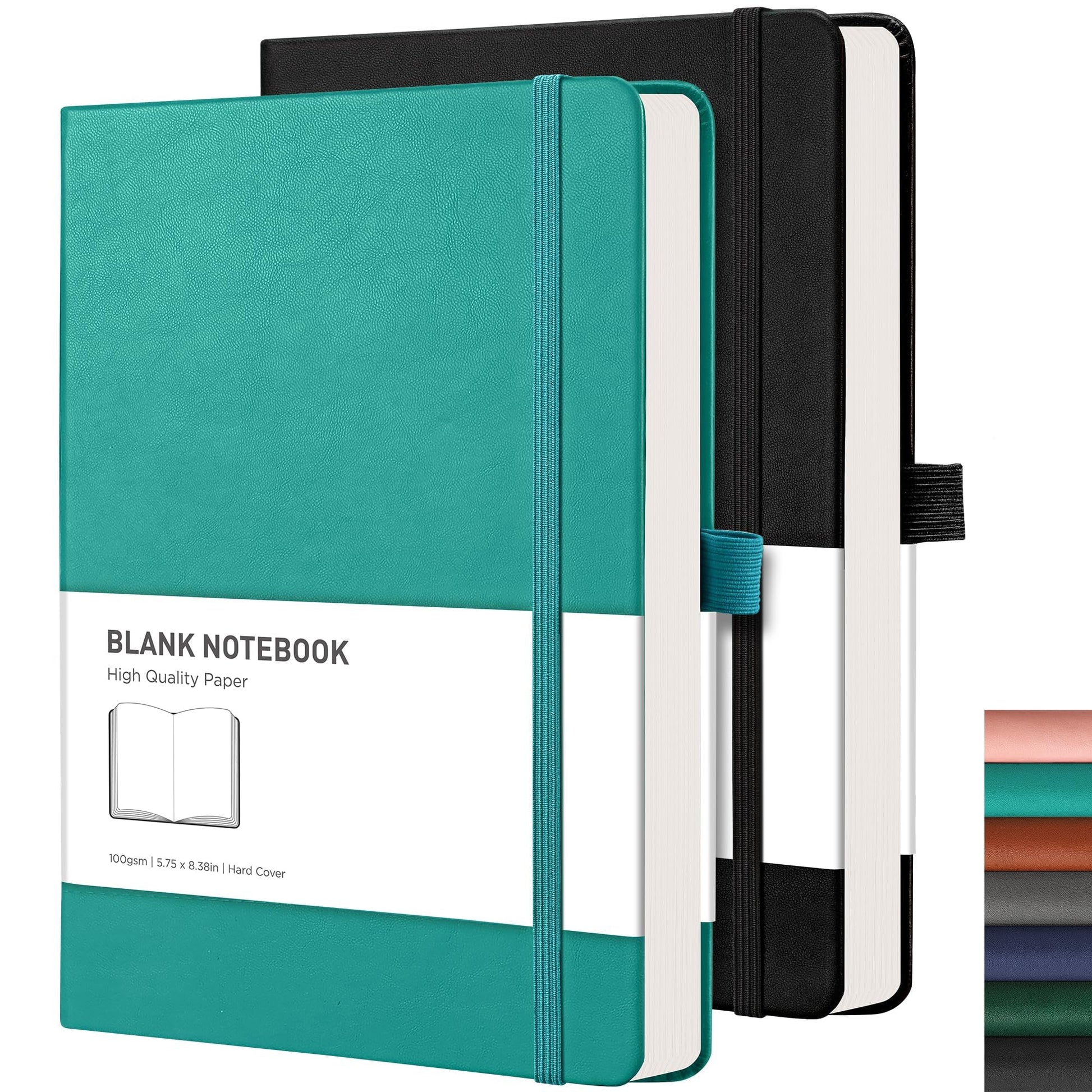 ["2 Pack Blank Notebook-Total comes with 2PCS blank page notebooks with A5 size ''5.75 × 8.38'', 96 sheets/192 pages per pack, totaling 384 pages.", "Durable Leather Cover-The high-quality leather cover makes the notebooks more durable and comfortable to touch, it can protect the pages inside for years and provide a comfortable writing surface.", "100GSM Quality Paper-Our blank notebook uses 100gsm acid-free paper with smooth texture, the pages are thick enough, no bleeding, will give you a happy journaling experience.", "Blank Journal Features-Each journal comes with an elastic closure, 1 pen holder loop, 2 bookmarks, 1 back pocket, and with humane rounded arc corner design.", "Great Use-Ideal for office, school, and home use, perfect as a sketch journal, travel journals, drawing notebooks, daily diary, bullet journaling, and more."]