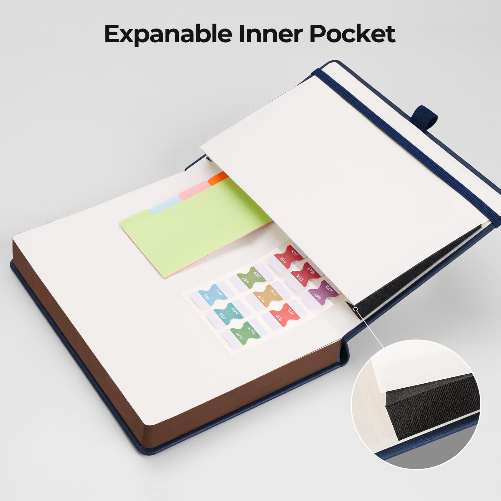 "Additional design: ❶ Separate sticky notes, 2 bookmarks for quicker retrieval of important content; ❷ High-quality PU leather cover, perfect for protecting the inner pages from creases and damage, etc. ❸ Expandable inner pocket on the back for sticky notes, business cards, small notes, etc.; ❹ Elastic bands on the back to secure the cover better, and an elastic pen holder loop for a pen."