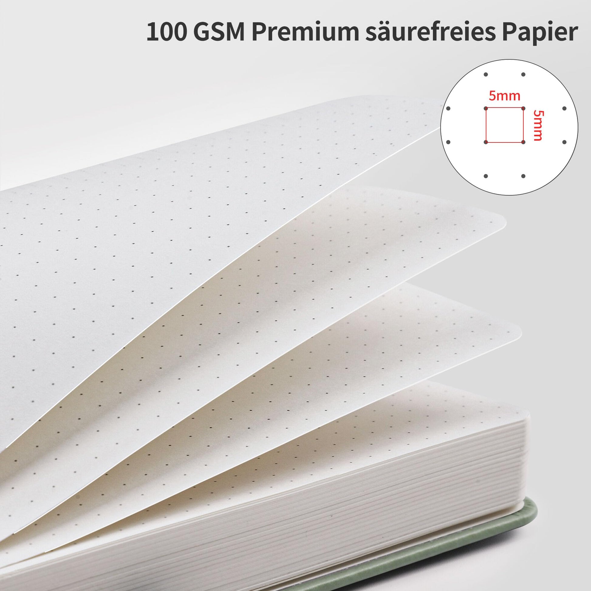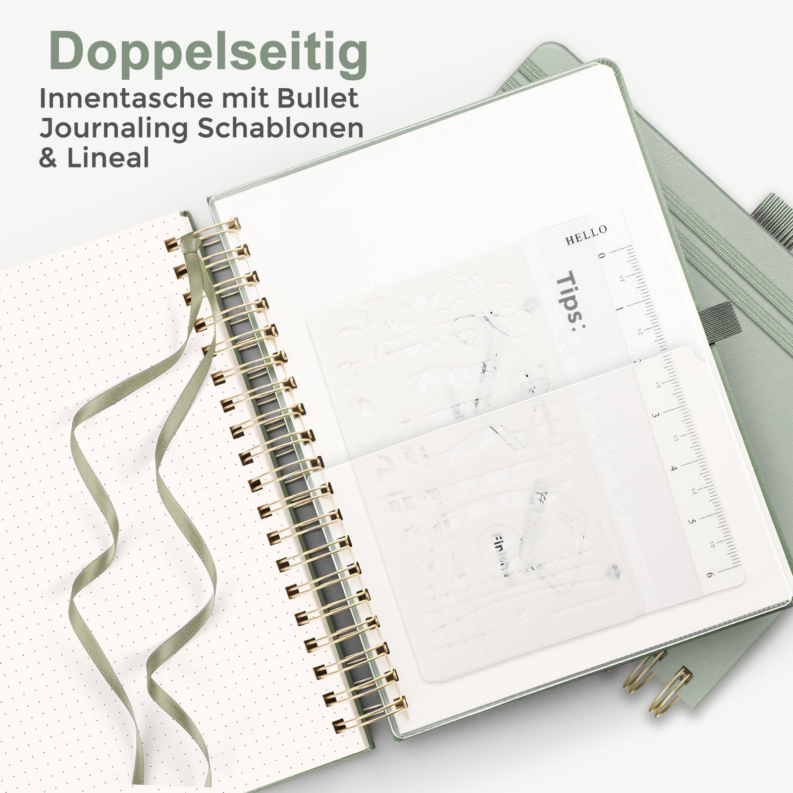 ["Premium Notebook Paper Quality: 100 gsm acid-free paper - prevents bleed through and feathering, compatible with all pens, perfect for Bullet Journaling, diary, or sketchbook.","Leather cover with spiral binding: Provides optimal protection for your notes and ensures durability. The 360° rotation and lay-flat design allow for easy writing with both hands, ideal for daily use.","150 sheets/300 pages DIN B5: Plenty of space for daily notes, to-do lists, and creative ideas - perfect for comprehensive use in the office or school.","Versatile Dotted Pages: Dotted pages are ideal for Bullet Journaling, sketches, to-do lists, and personal notes - perfect for creative minds seeking structure and flexibility!","Useful Accessories for Better Notes: The inner pocket holds small items, the lightweight ruler for precise drawings, ribbon ensures quick retrieval while the Bullet Journaling stencils offer creative design possibilities."]
