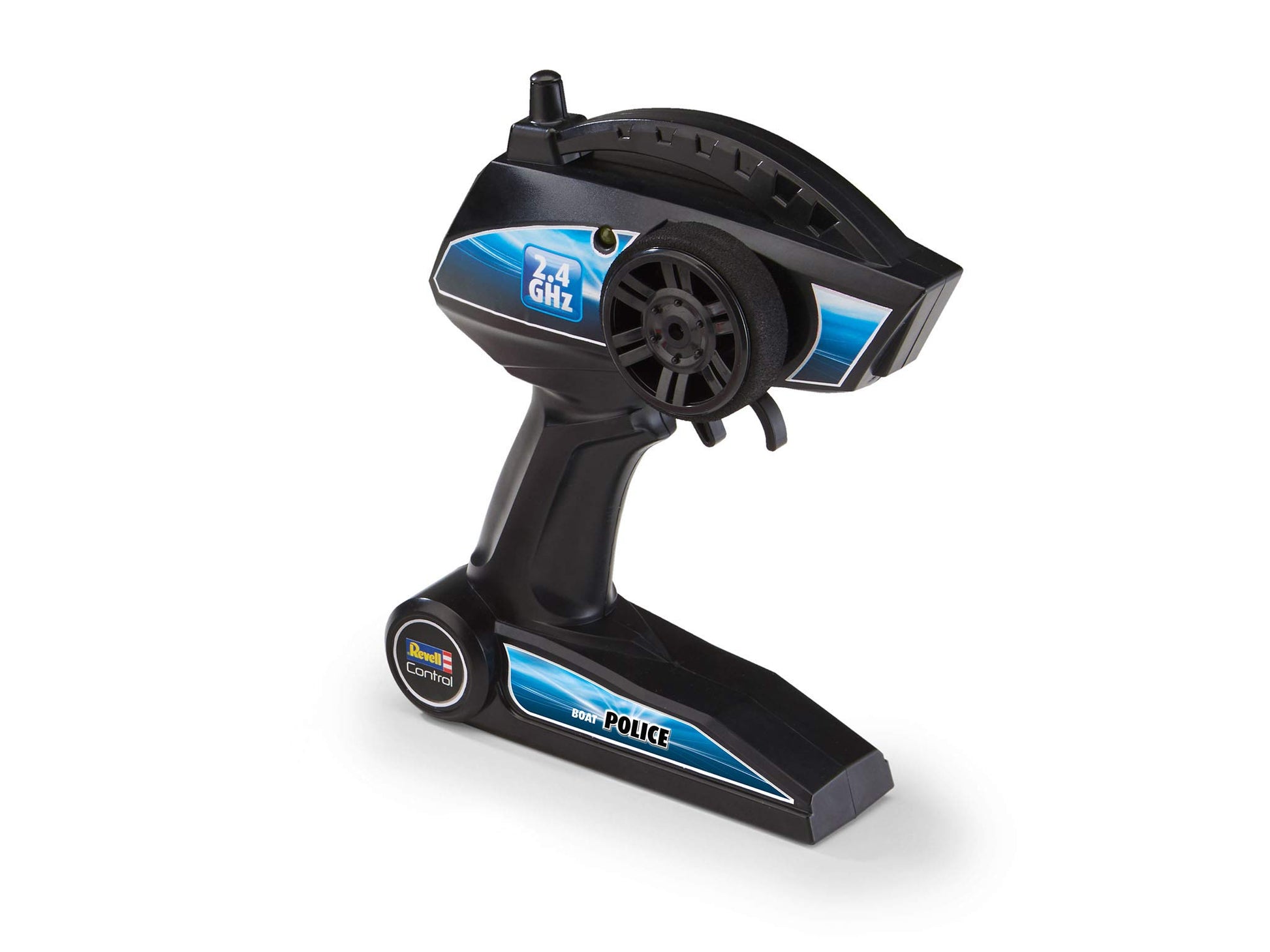 ["POLICE ACTION - With our fast and agile police boat, you'll feel like you're becoming the guardian of the law and catching criminals. The boat features a cool police design and is equipped with two powerful electric motors that provide plenty of power. The completely sealed electronics also protect you from water intrusion during wild maneuvers, so you can go on the hunt for criminals even in bad weather.","POWERFUL BATTERY - Thanks to the integrated Li-Ion battery, you can enjoy up to 15 minutes of driving fun, and with the included USB charging cable, the boat is quickly ready for action again. The ergonomic pistol remote control allows for quick and agile maneuvering, allowing you to keep an eye on things even in the toughest situations and chase down criminals.","CHASE WITH FRIENDS - And the best part: With the 2.4 GHz technology, you can control boats with your friends without interfering with each other. And the included safety circuit prevents the propellers from starting outside the water, so you can hunt down criminals safely and without risk of injury. Go on a crime spree with your friends now.","PISTOL REMOTE CONTROL - Maneuvering this police boat is a breeze with the ergonomic pistol remote control. Dodging obstacles and making quick getaways becomes child's play - the criminals won't know what hit them! With our police boat, you get a high-quality and robust RC boat that provides a realistic driving experience and takes you on exciting adventures on the water. Discover the fascinating world of RC boats with Revell now and experience unforgettable moments on the water!","REVELL RC BOATS - Discover a new world on the water with Revell RC boats and experience thrilling adventures. Our RC boats are suitable for both children and adults, offering high quality and easy handling. Whether you prefer high-speed races on the lake or gliding peacefully over the water, we have the right RC boat for you. Our models are sturdy and durable, so you will enjoy them for a long time. Equipped with remote control and powerful motors, our RC boats are easy to control and offer a realistic driving experience. Discover the fascinating world of RC boats with Revell now!"]