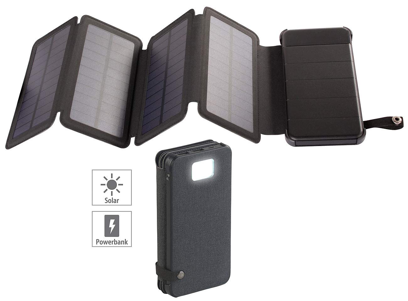 ["Up to 40 extra hours for your mobile device • Folding 4-panel solar panel with 5 watts of power • Charges 2 USB mobile devices simultaneously • Status LEDs for battery level • Switchable LED lamp with 3 light modes", "Integrated LiPo battery with 8,000 mAh: up to 40 extra hours for your mobile device • 4 blue status LEDs for battery level • Dimensions: 156 x 82 x 30 mm, Weight: 354 g", "Charges 2 mobile devices simultaneously: 5 volts each, 2.1 A, max. total 2.1 A / 10.5 watts • Removable protective cover with folding 4-panel solar panel: charges power bank with 5 watts via solar energy", "LED lamp with 100 lumens and 3 light modes: constant light, SOS flashing function and constant flashing • Also chargeable via USB (please order power supply separately)", "Solar Power Bank PB-85.s including USB charging cable and German instructions. Solar Mobile Charging - Also relevant or suitable for: Solar cell charger, Outdoor on the go, Mini solar system, Work light, Tablet case, Solar lights, Car, Power generator, Apple iPhone, Solar light, Night light, MP3 player, Portable, Foldable, Battery, Portable, Emergency, Portable, Lantern, Hiking, Mobile, Foldable, External, Power, Panel, Batteries, Tents, mobile, Charging, Bank"]