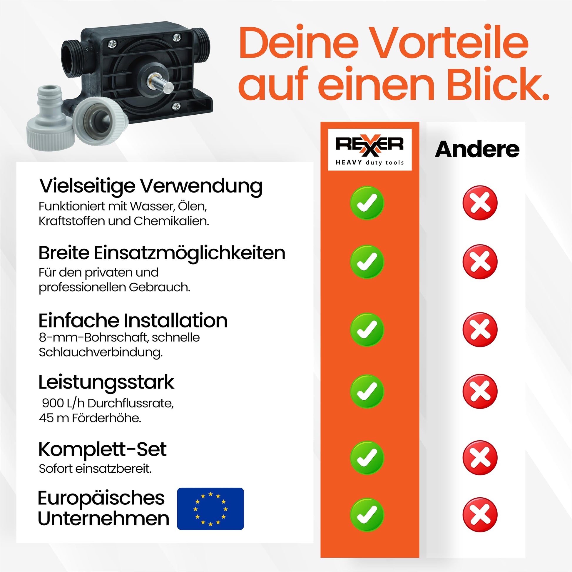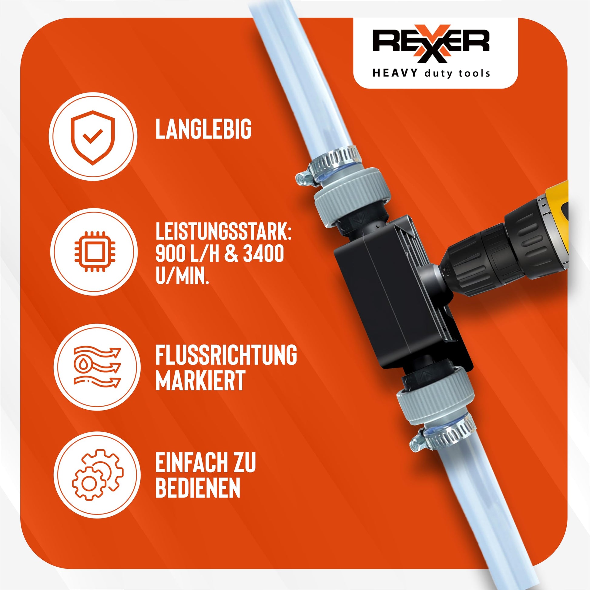 REXXER Water Pump (Set) - Drill pump/Cordless screwdriver pump - ready for immediate use with 2m hose, clamps, & 2x hose couplings (900 l/h)