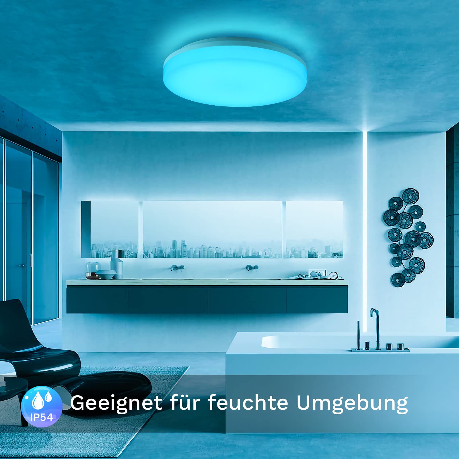 ["🎨【RGB Color Spectacle】Experience a colorful life! Bedroom ceiling light not only offers a selection of 7 vibrant RGB colors, but also two fascinating RGB modes (single colors and color changing). Whether it's a party, festival, or romantic moments - it creates the perfect lighting atmosphere for any occasion! ✨","💡【High Performance & Energy Saving】This high-quality LED ceiling light allows you to adjust the color temperature (Warm White-Neutral White-Cool White+Night Light) and brightness (10%-100%) steplessly. Create the perfect lighting! 🌟 With the memory function, the lamp retains your last settings for a personalized lighting experience!","🌙【Remote Control & Wall Control】This bedroom lamp can be dimmed via a remote control or wall control. With the remote control, you can also adjust the brightness to 10% to use it as a night light (the wall control cannot adjust the brightness of the ceiling light).","🍀【Environmentally Friendly and Energy Efficient】High-quality lamp beads require very little energy to produce bright light. This not only saves electricity costs, but also reduces energy consumption, lowers carbon emissions, and protects the environment. Our ceiling lights actively contribute to these environmentally friendly measures.","💧【IP54 Water Resistance】Enjoy comprehensive protection! The LED ceiling light features an integrated IP54 waterproof seal to prevent insects & dust from entering the lamp. It is suitable for bathrooms, living rooms, bedrooms, children's rooms, dining rooms, studies, and offices. With the bathroom lamp, you can enjoy a safe and comfortable lighting experience!"]