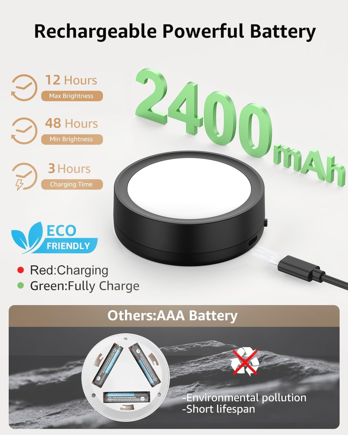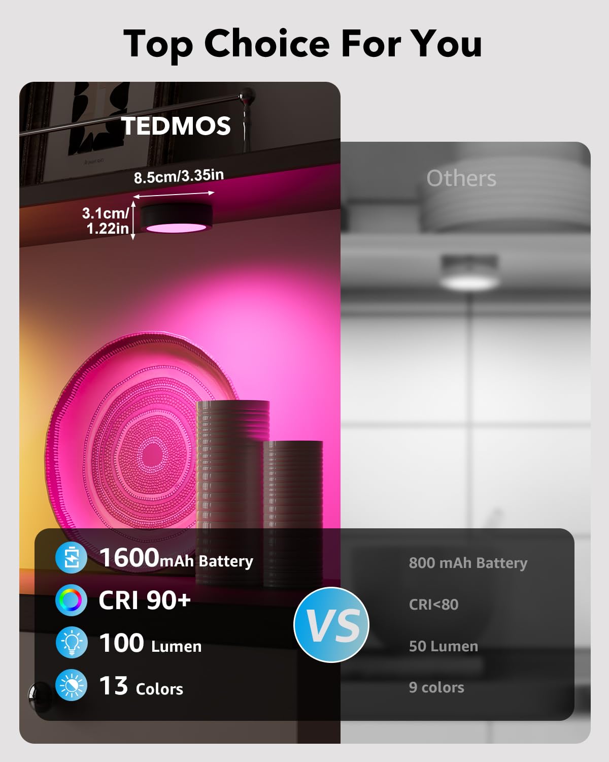 ["🌈【USB Rechargeable & Longer Runtime】Black USB rechargeable LED RGB spot has a built-in 2400mAh battery, you don't need to buy additional batteries, saving money and environmentally friendly. It takes 3h to fully charge. After full charge, the wireless display lighting can last about 12h at brightest and 48h at darkest. The battery-operated LED spot with remote control can not only help you see things clearly, but also create the perfect atmosphere.","🌈【2 Control Modes & 10%-100% Dimmable】These RGB round cabinet lights come with a remote control for adjusting color/brightness/timer. You can also press short on the lampshade of the RGBW display lighting with battery to change the light color, longer press can help you find the most suitable brightness. Our color-changing LED spot has 10 brightness levels and a timer function, so you can customize your lighting.","🌈【13 Vivid Colors & 2 Dynamic RGB Modes】Our RGB display lighting has 9 LED lamp beads, double the number of lamp beads compared to other products! The remote control of the LED spot with color change is preset with warm white and 12 vivid colors. The magnetic LED spot features 2 dynamic RGB modes to provide you with a warm and romantic atmosphere. At the same time, the high-quality screen design of this kitchen LED round under-cabinet light makes the light bright but not dazzling.","🌈【Magnetic Under Cabinet Light, Easy Installation】The cordless under-cabinet light with remote control integrates magnets into the back. This allows it to be securely attached to the mounting strip and any magnetic metal surface. This RGB LED spot with remote control can be used not only as an RGB ambient light and wall decoration light, but also as a round cabinet light, round stair light, or night light to illuminate any dark corner in your home.","🌈【100% Satisfactory】Once you order your LED spot with battery and remote control, you will receive a 12-month hassle-free exchange. This LED spot with battery does not contain harmful chemicals and lasts longer than other normal self-adhesive LED spots. Please feel free to contact us if you have any questions about our round cabinet light. The most important thing is that wireless display lighting can help you achieve optimal lighting & the best room ambiance.","🌈【About Tedmos】"Simple light, simple life" - that's what drives us at Tedmos since 2018. We believe good design doesn't have to be complicated. We help you enrich your home with beauty and functionality simply and affordably. This cordless LED shelf light is practical and beautiful at the same time. We hope our kitchen LED battery under-cabinet light will be your new companions - just there and bring you joy.""]