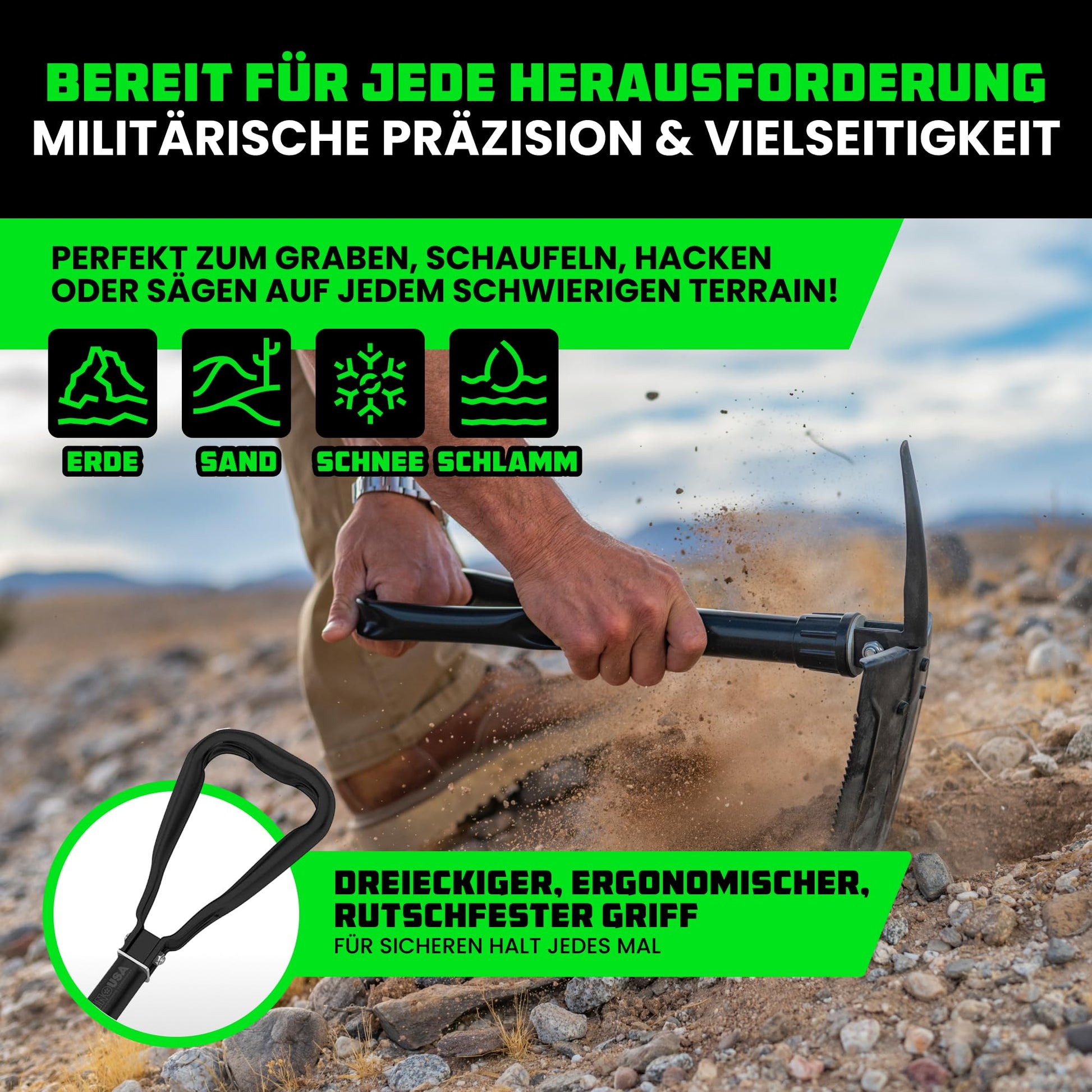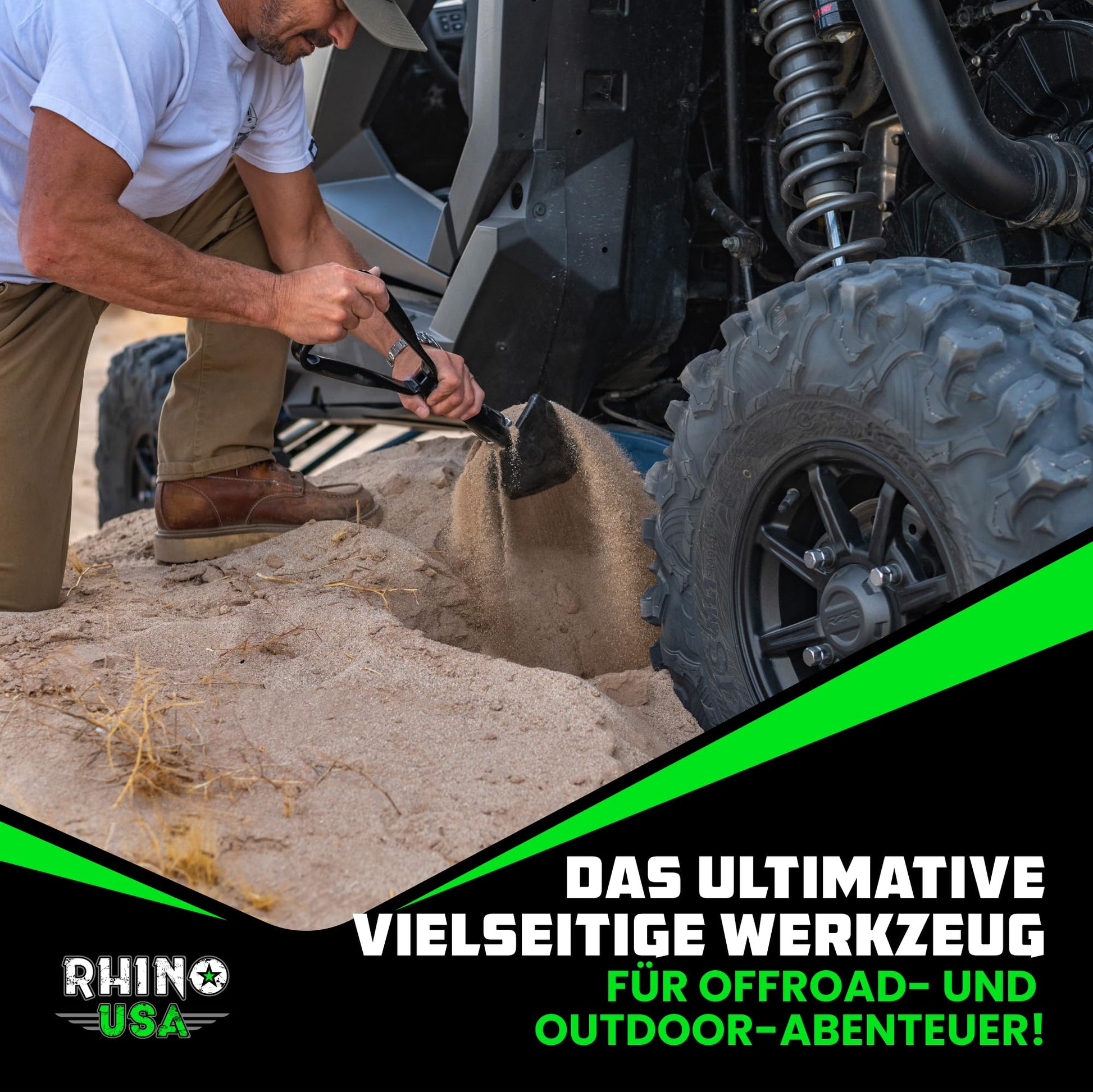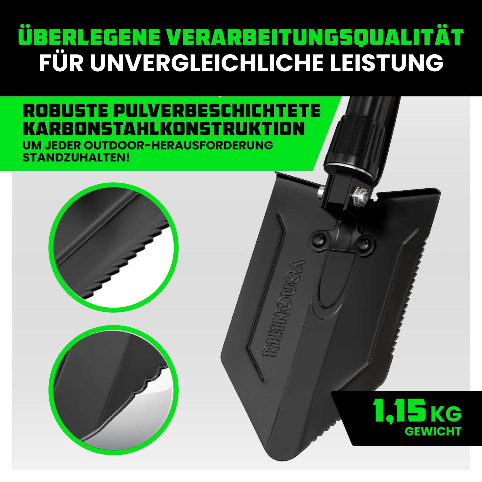 ["3-IN-1 MULTIFUNCTIONAL - Versatile design with a 180-degree shovel, 90-degree pickaxe, and 90-degree axe to tackle different tasks with a single tool.","COMPACT AND PORTABLE - Measures 56 cm when unfolded, but can be folded down to just 23 x 15 cm and fits into the included sturdy carrying bag; weighs only 0.9 kg for effortless portability.","CARBON STEEL CONSTRUCTION - Made from carbon steel with black powder coating for added strength, corrosion resistance, and a rugged, durable appearance.","REAL LIFETIME REPLACEMENT - All Rhino USA products come with a lifetime replacement. If you encounter any issues, we will ensure you are 100% satisfied with a replacement or refund."]